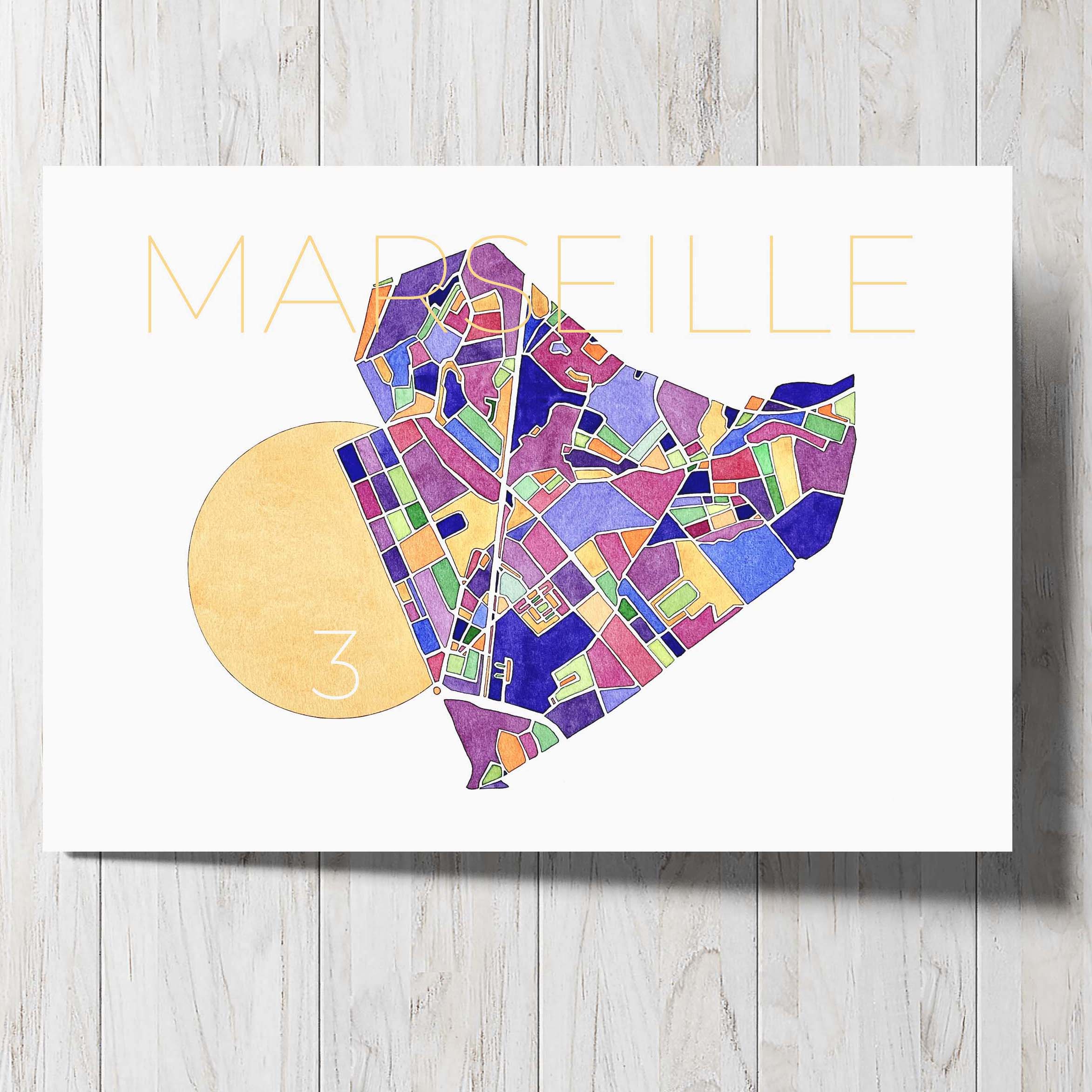 Un plan artistique du 3e arrondissement de Marseille, quartier dense et créatif.