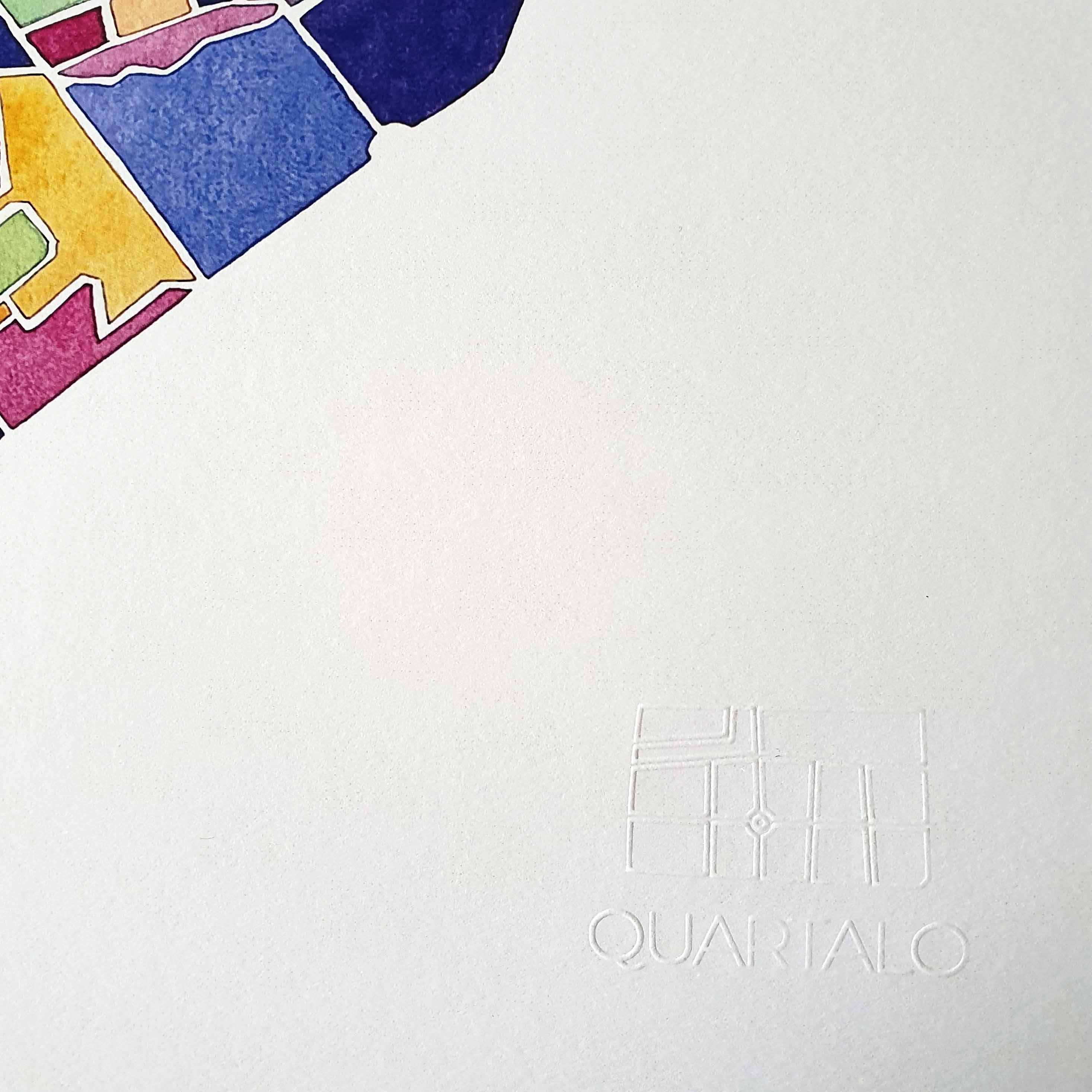 La palette vive compose un ensemble dynamique. Les masses colorées structurent l’espace tandis que les tracés conservent une lecture claire du territoire. L’aquarelle apporte profondeur et intensité, traduisant l’identité en mouvement du quartier.