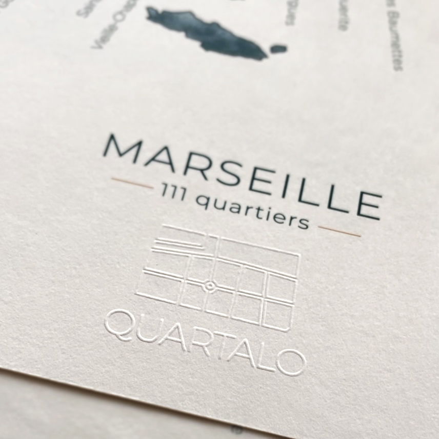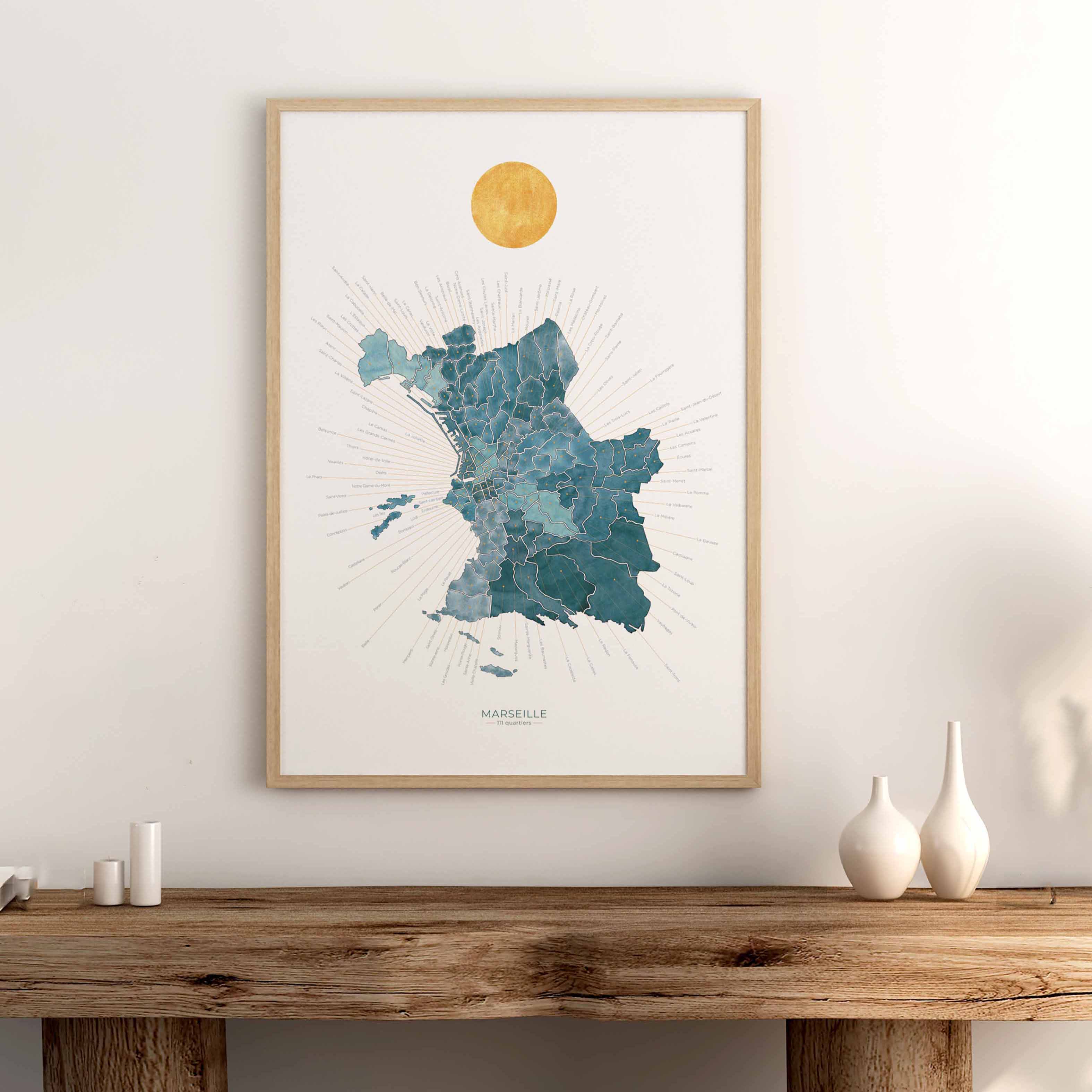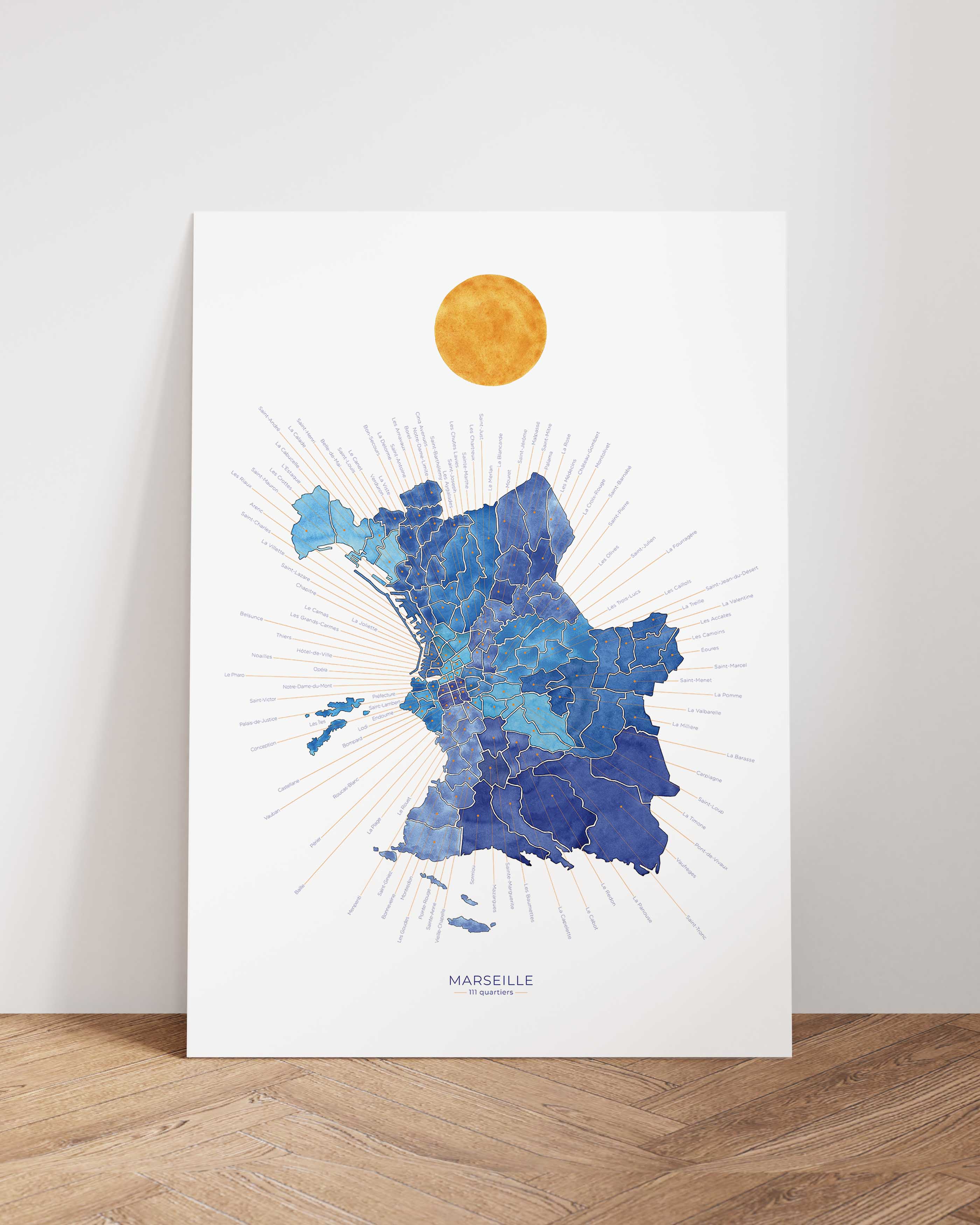 Cartographie artistique Un plan de la Cité Phocéenne réunissant ses 111 quartiers, chacun nommé et localisé. Illustration originale peinte à la main à l’aquarelle. Une carte précise et sensible...