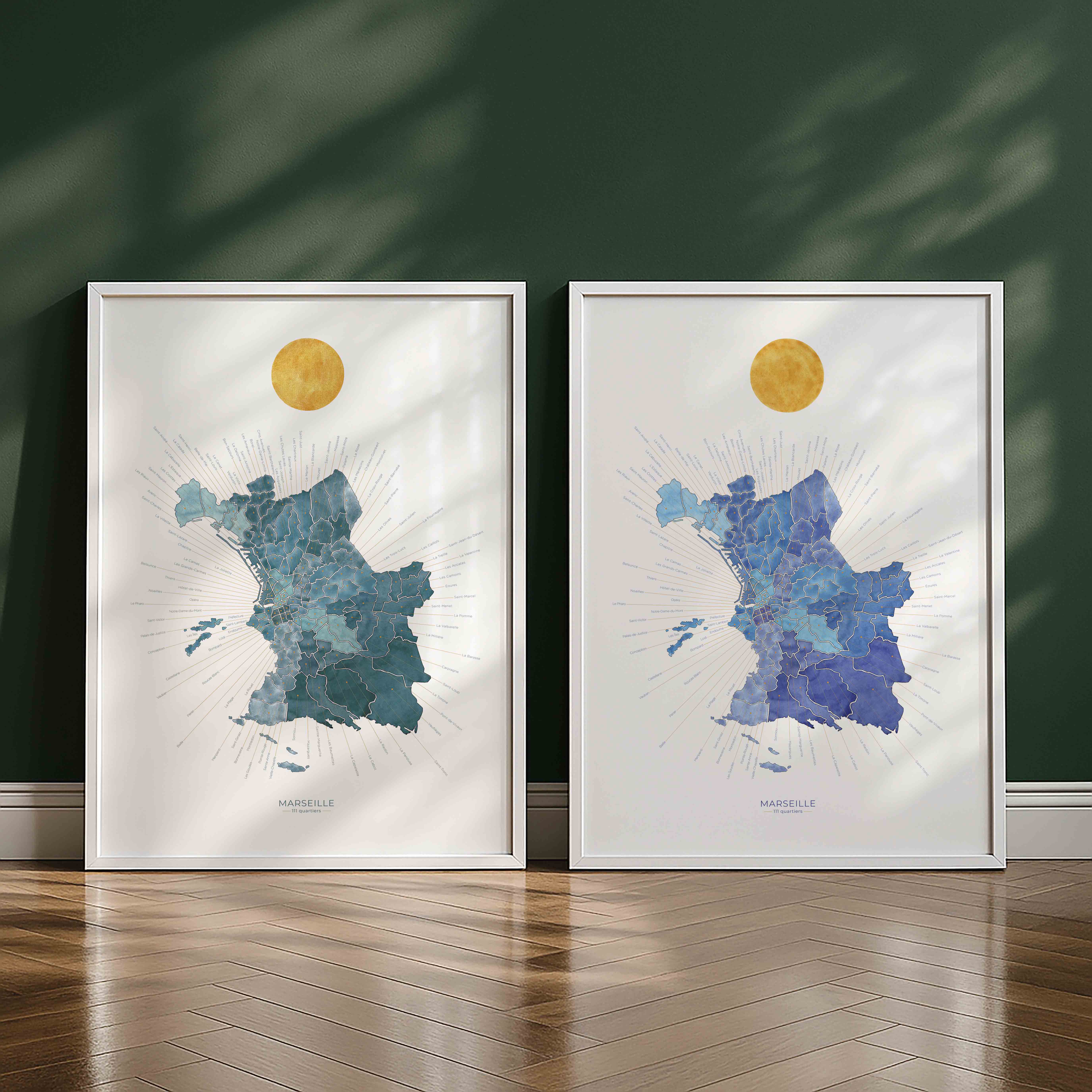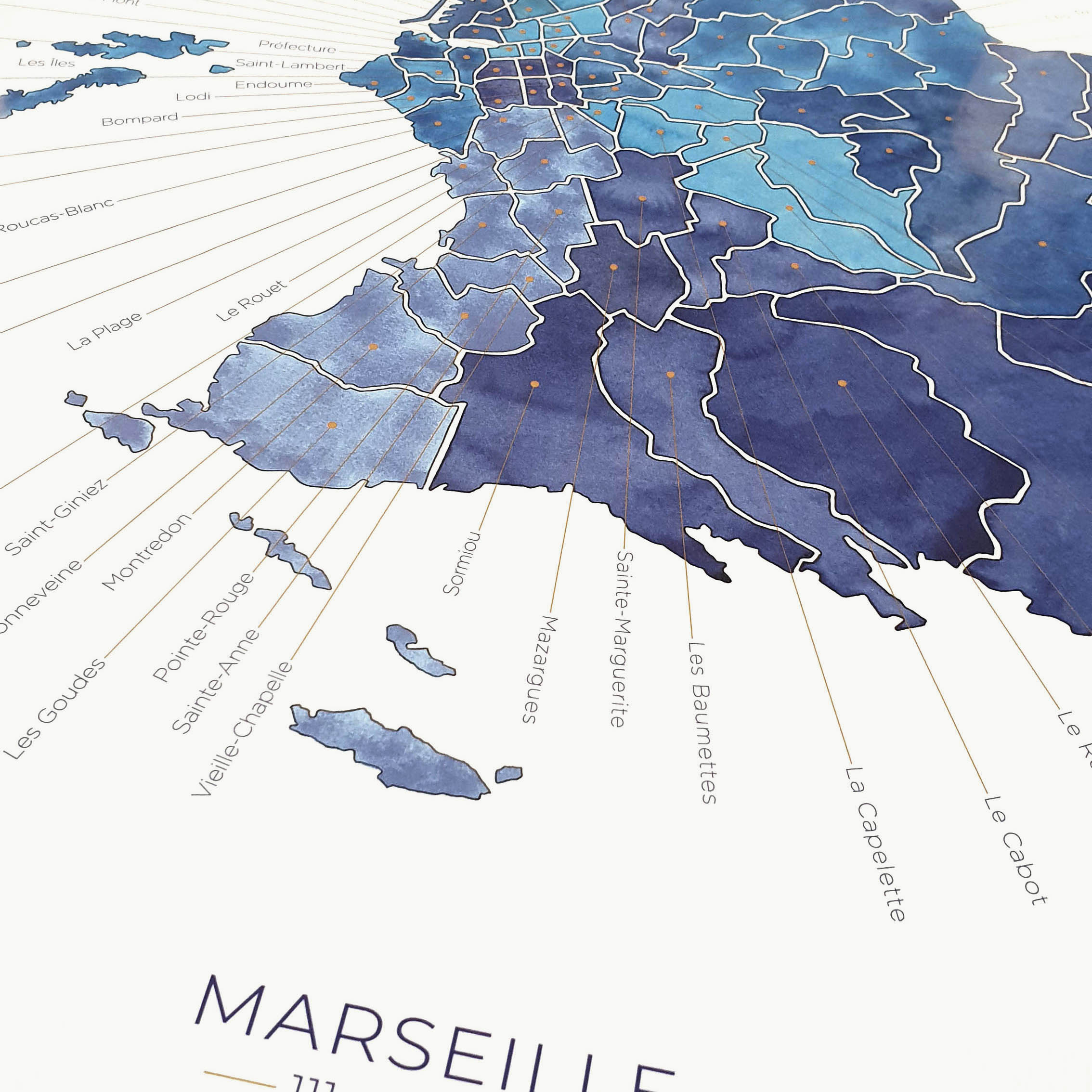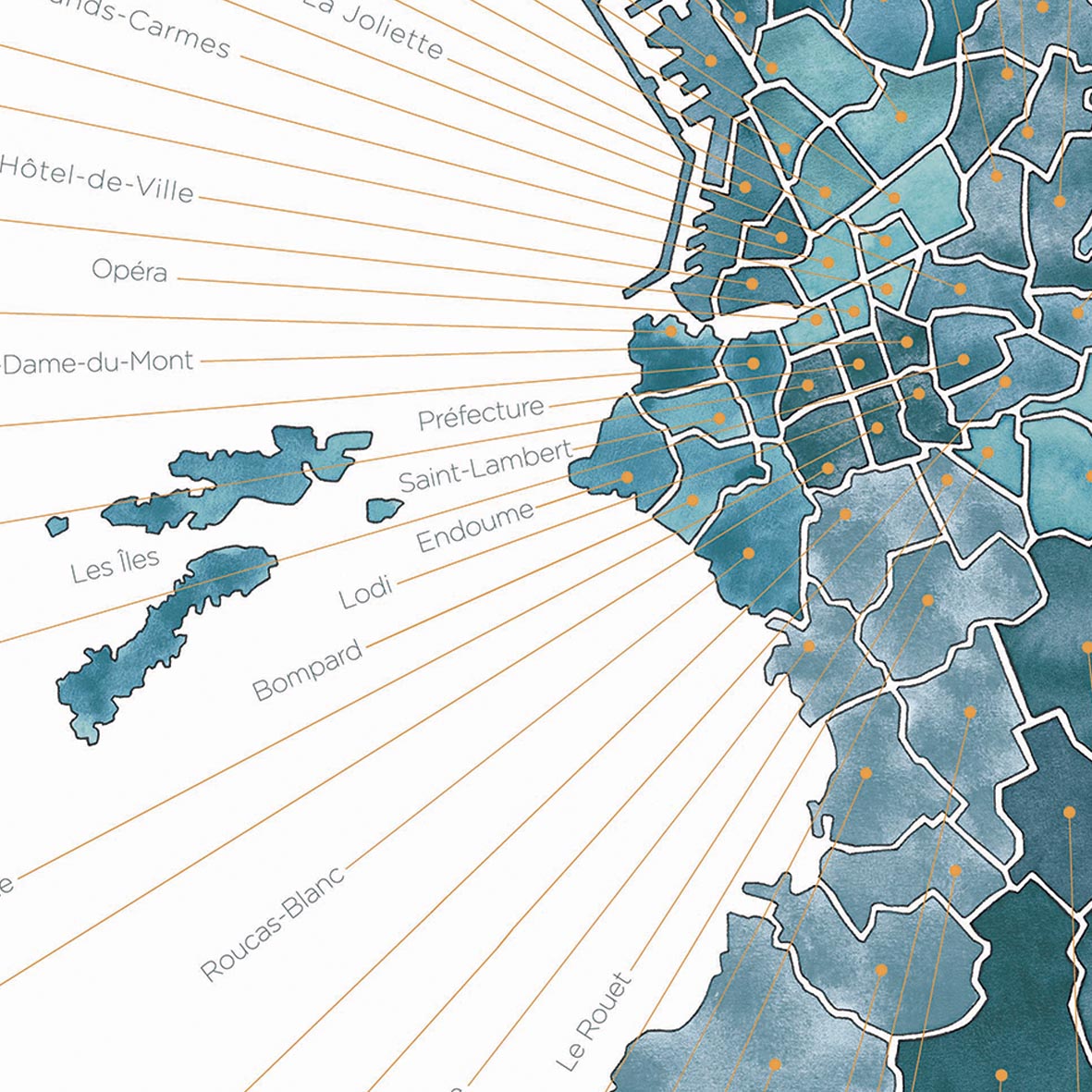 Cartographie artistique Un plan de la Cité Phocéenne réunissant ses 111 quartiers, chacun nommé et localisé. Illustration originale peinte à la main à l’aquarelle. Une carte précise et sensible...