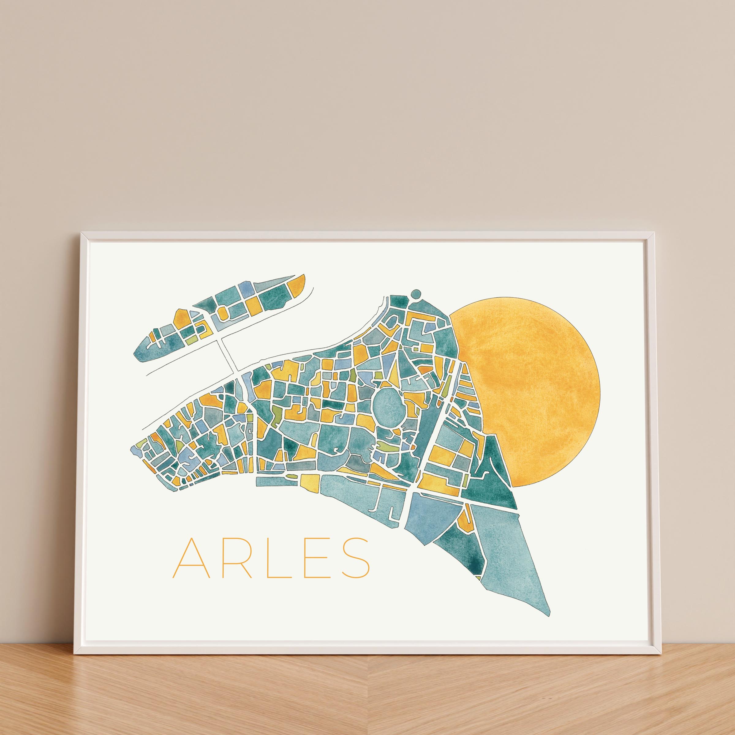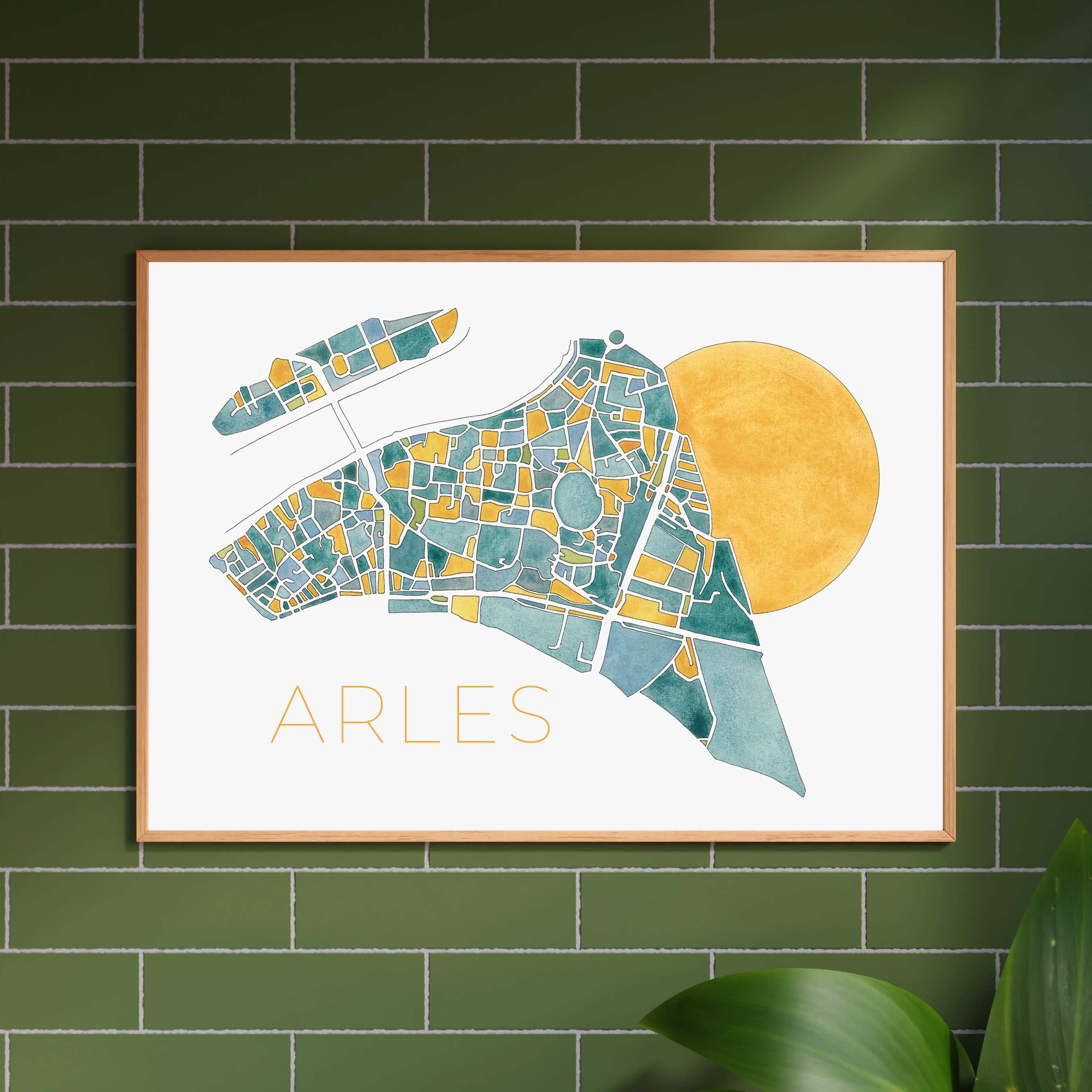Un plan artistique d’Arles, entre patrimoine antique et création contemporaine. Peinte à la main à l’aquarelle, cette carte révèle la structure lumineuse de la ville provençale. Une manière...