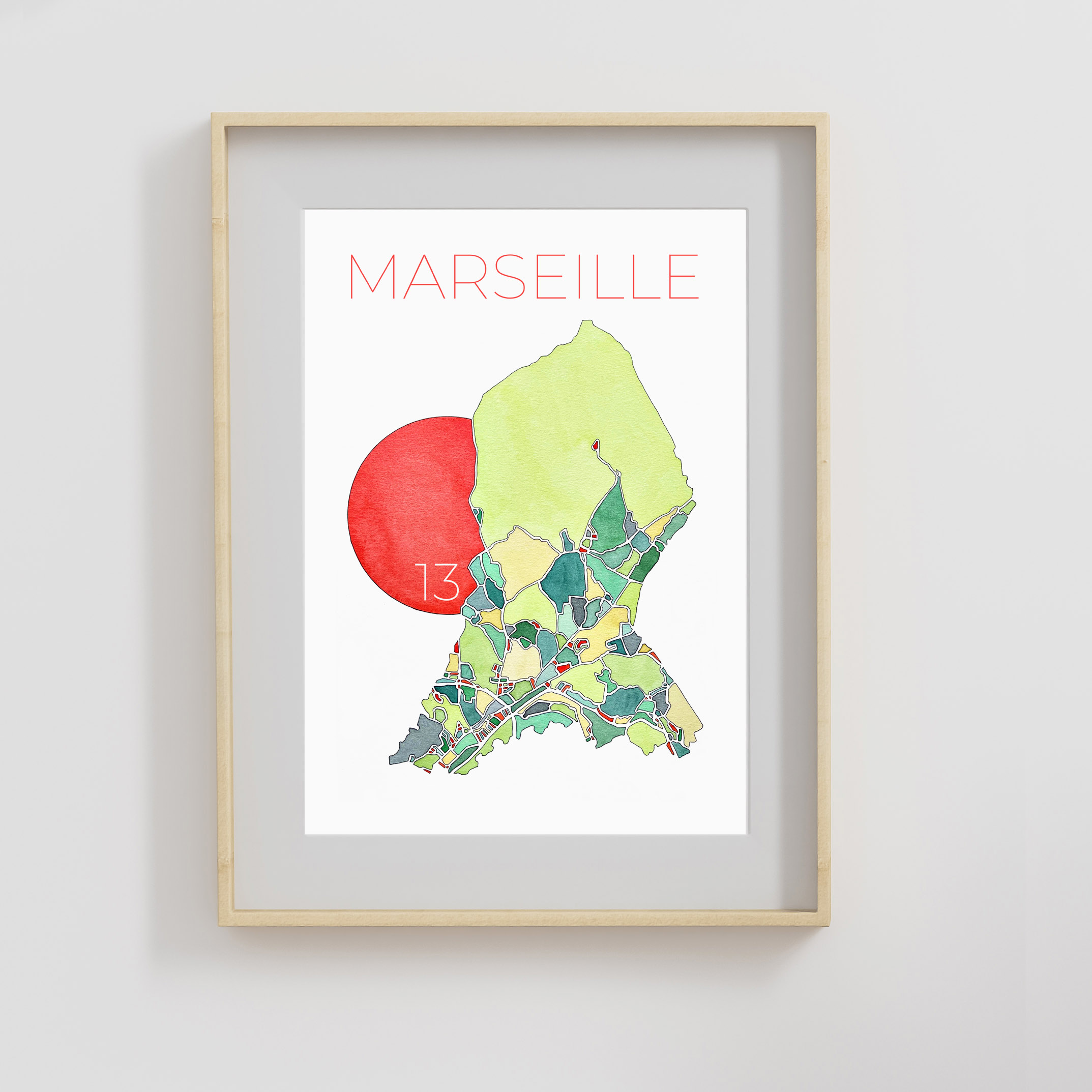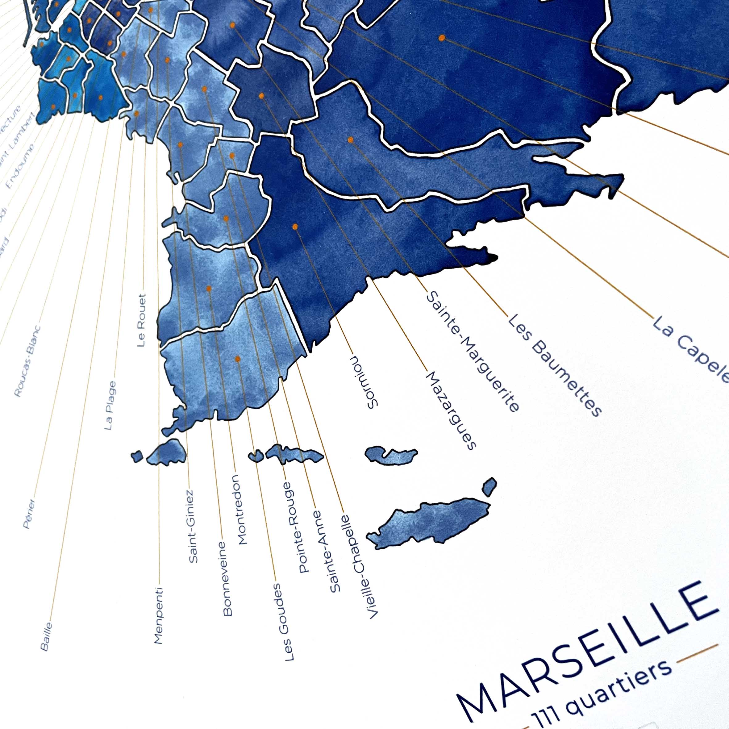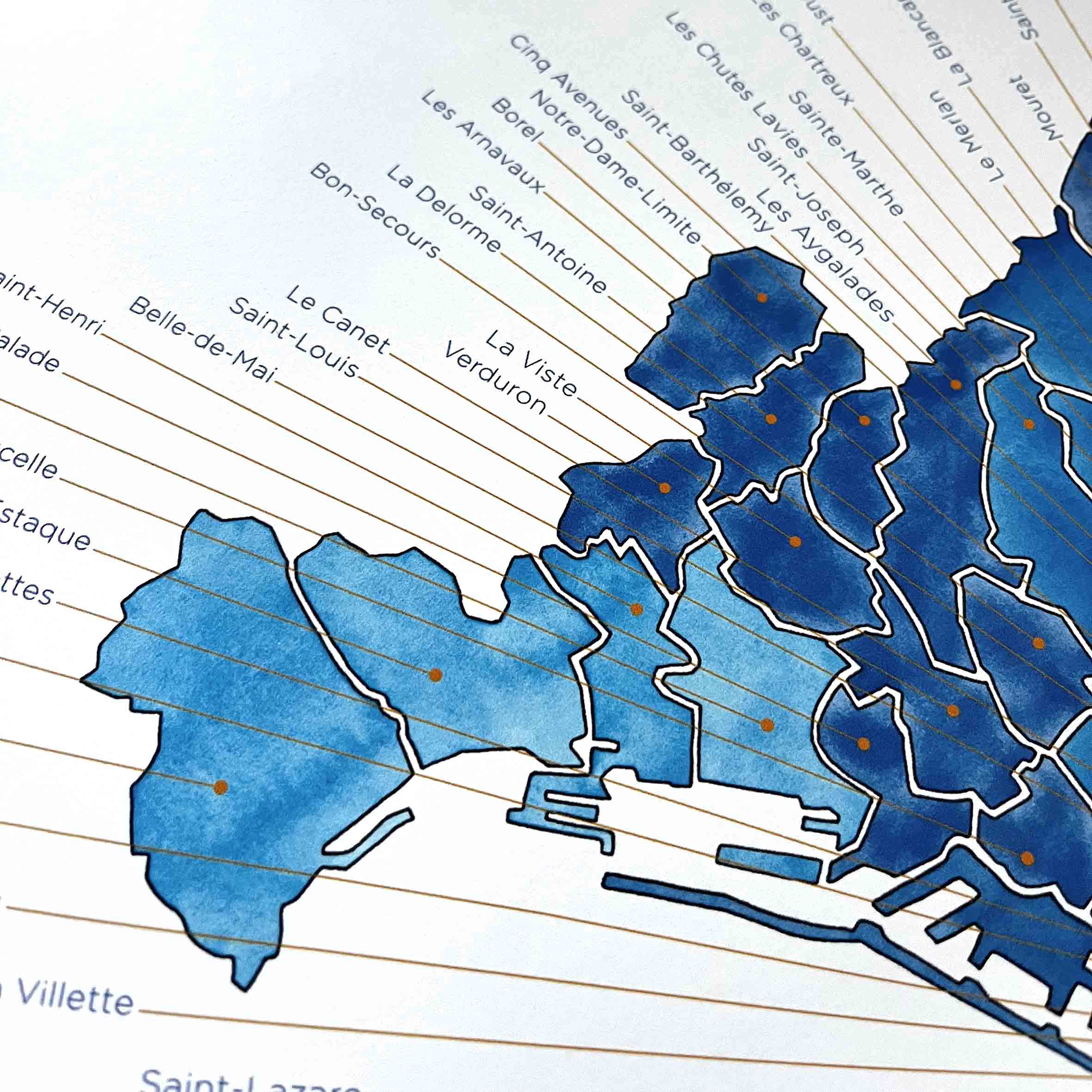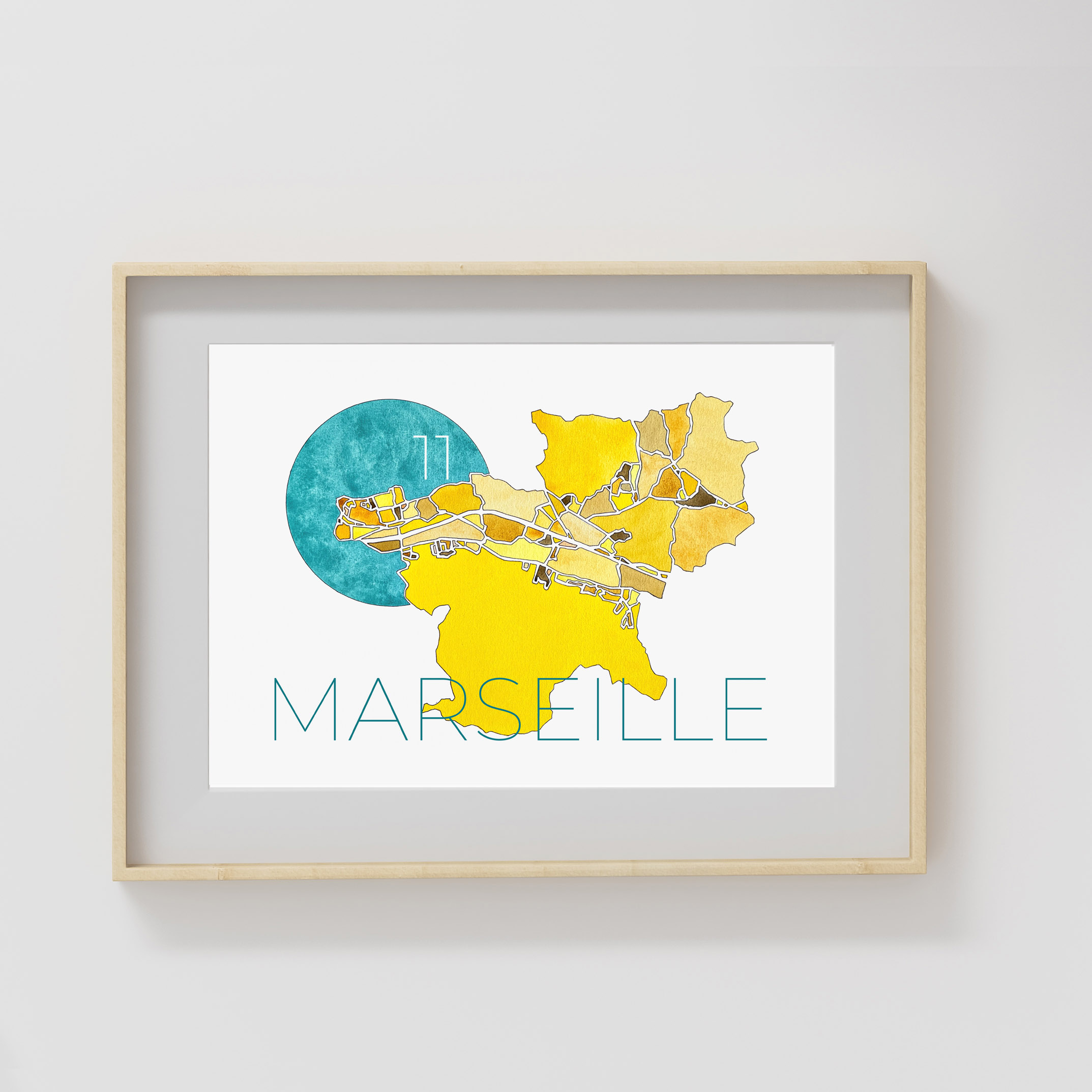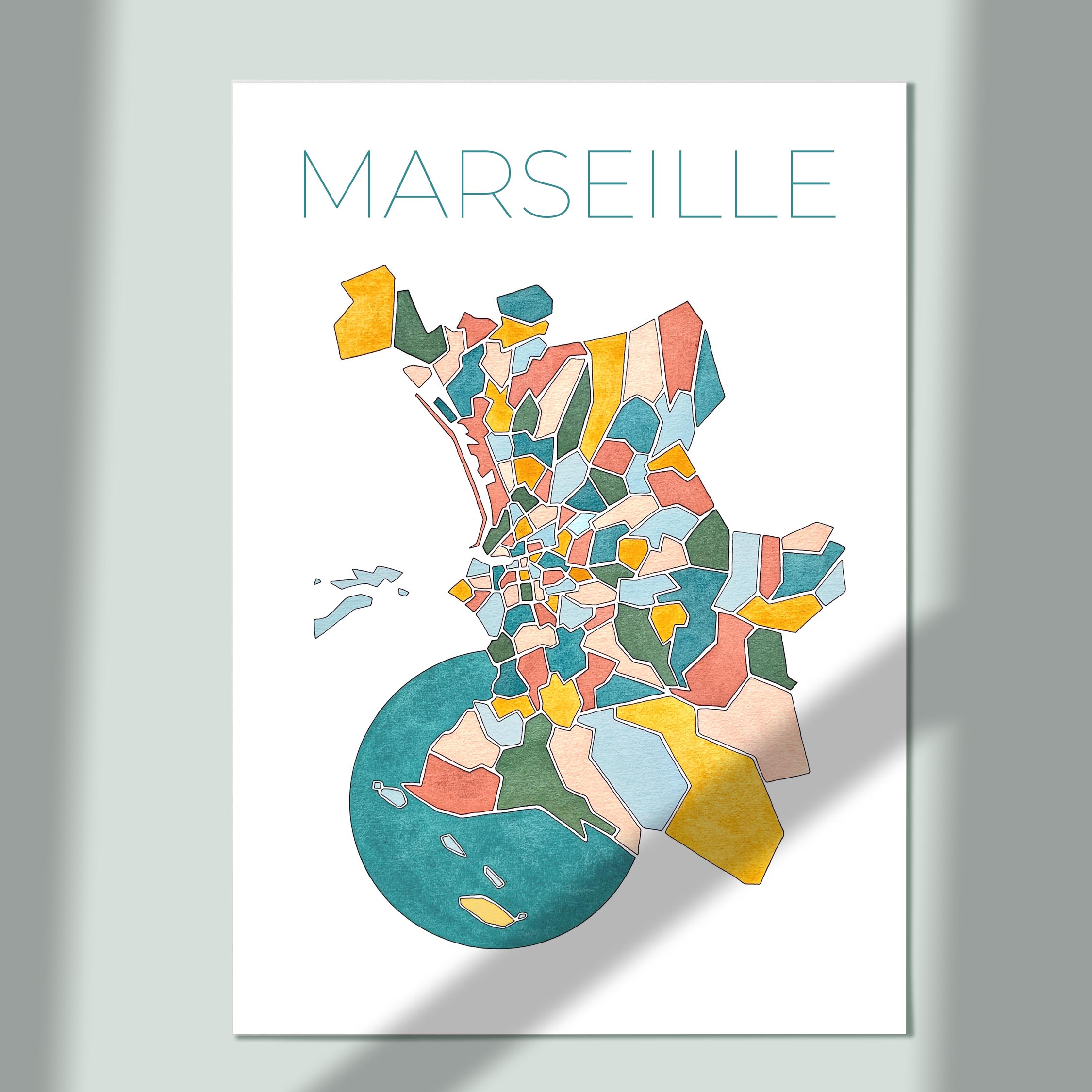 Un plan artistique de la Cité Phocéenne réunissant ses 111 quartiers, chacun nommé et localisé. Peinte à la main à l’aquarelle, cette carte révèle la ville dans toute sa diversité, entre mer,...