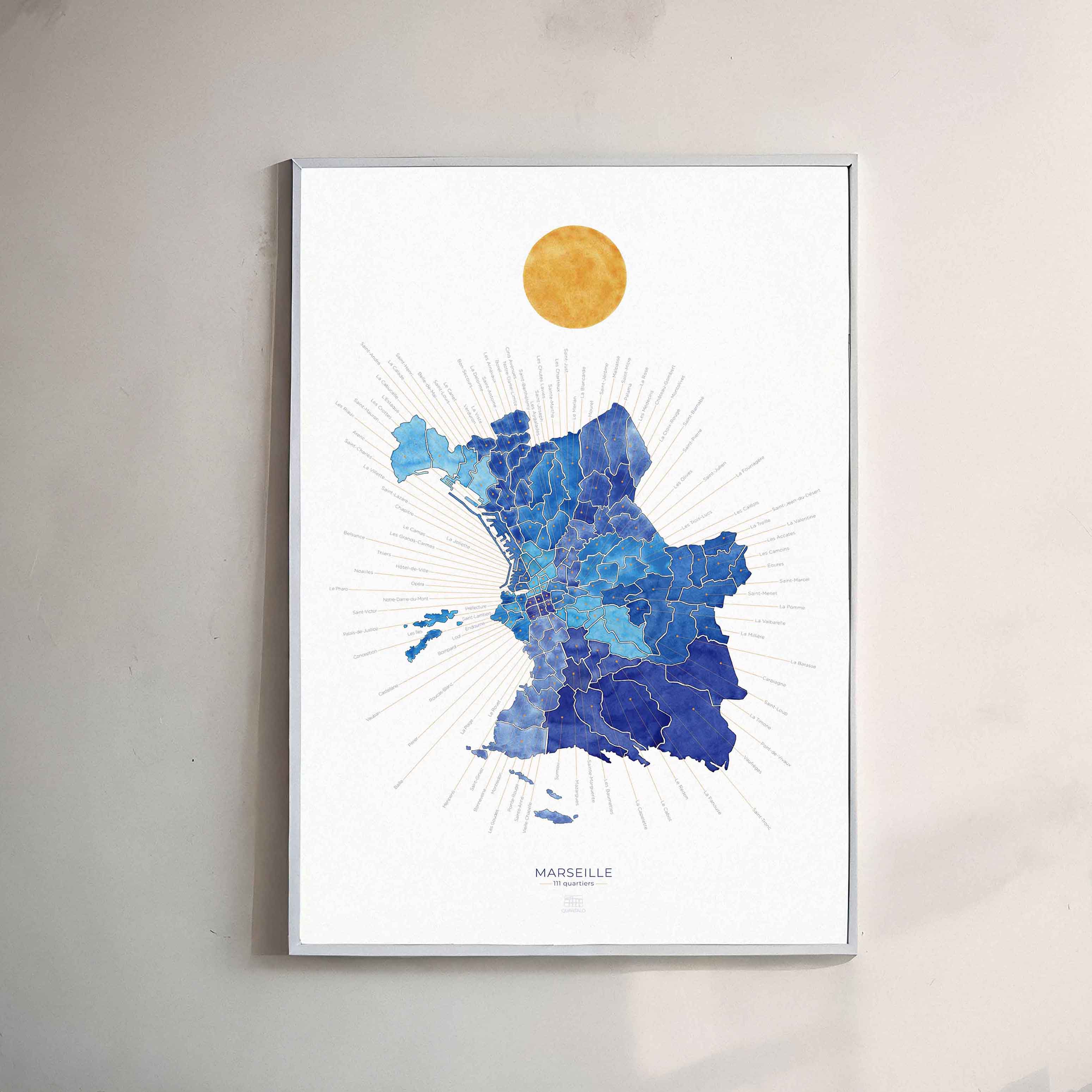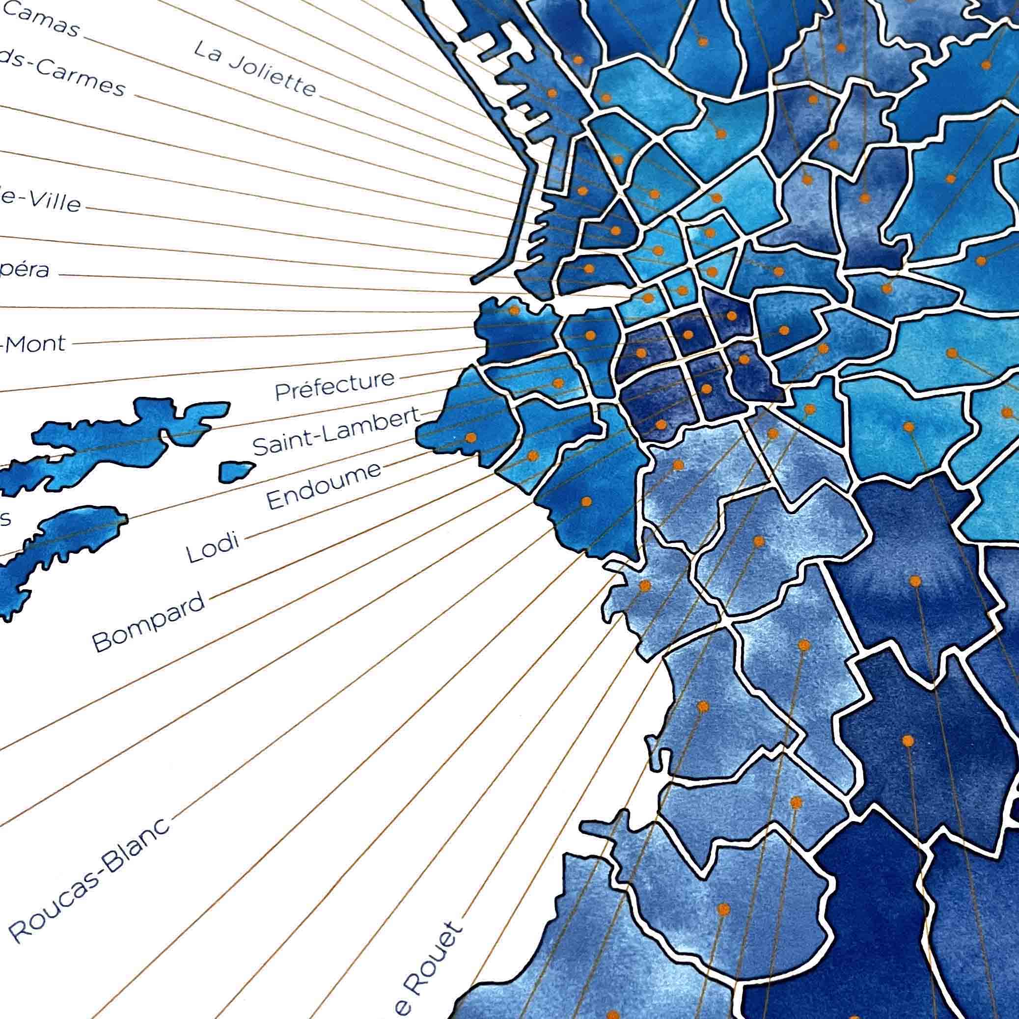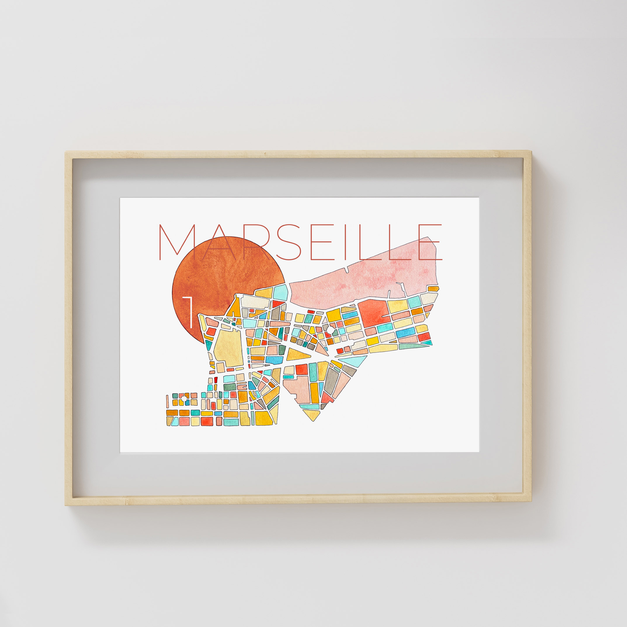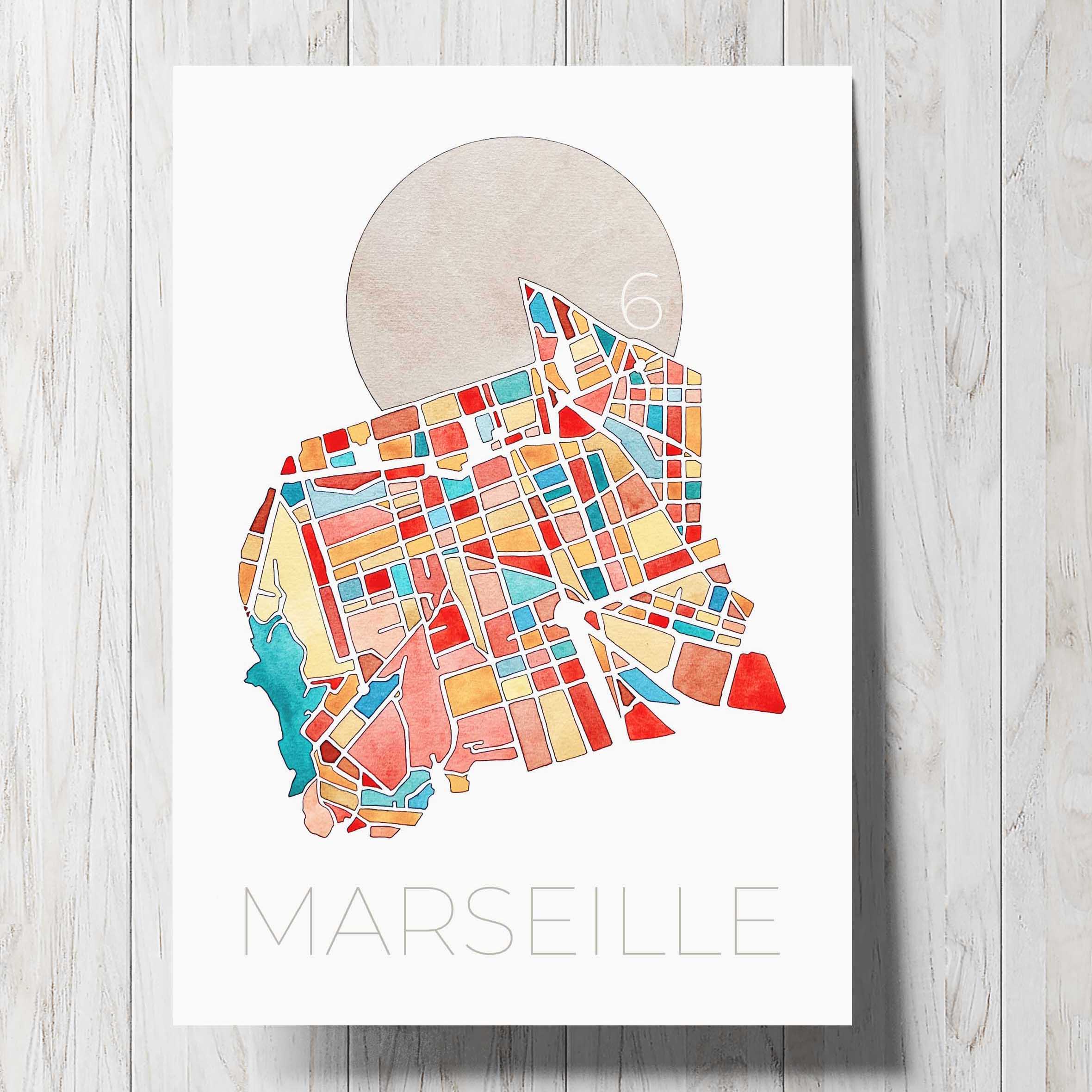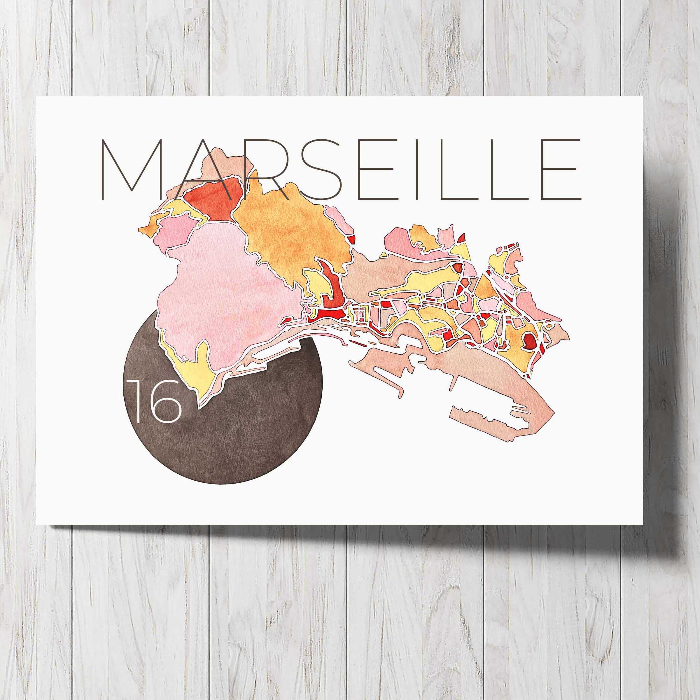 Un plan artistique de la Cité Phocéenne réunissant ses 111 quartiers, chacun nommé et localisé. Peinte à la main à l’aquarelle, cette carte révèle la ville dans toute sa diversité, entre mer,...