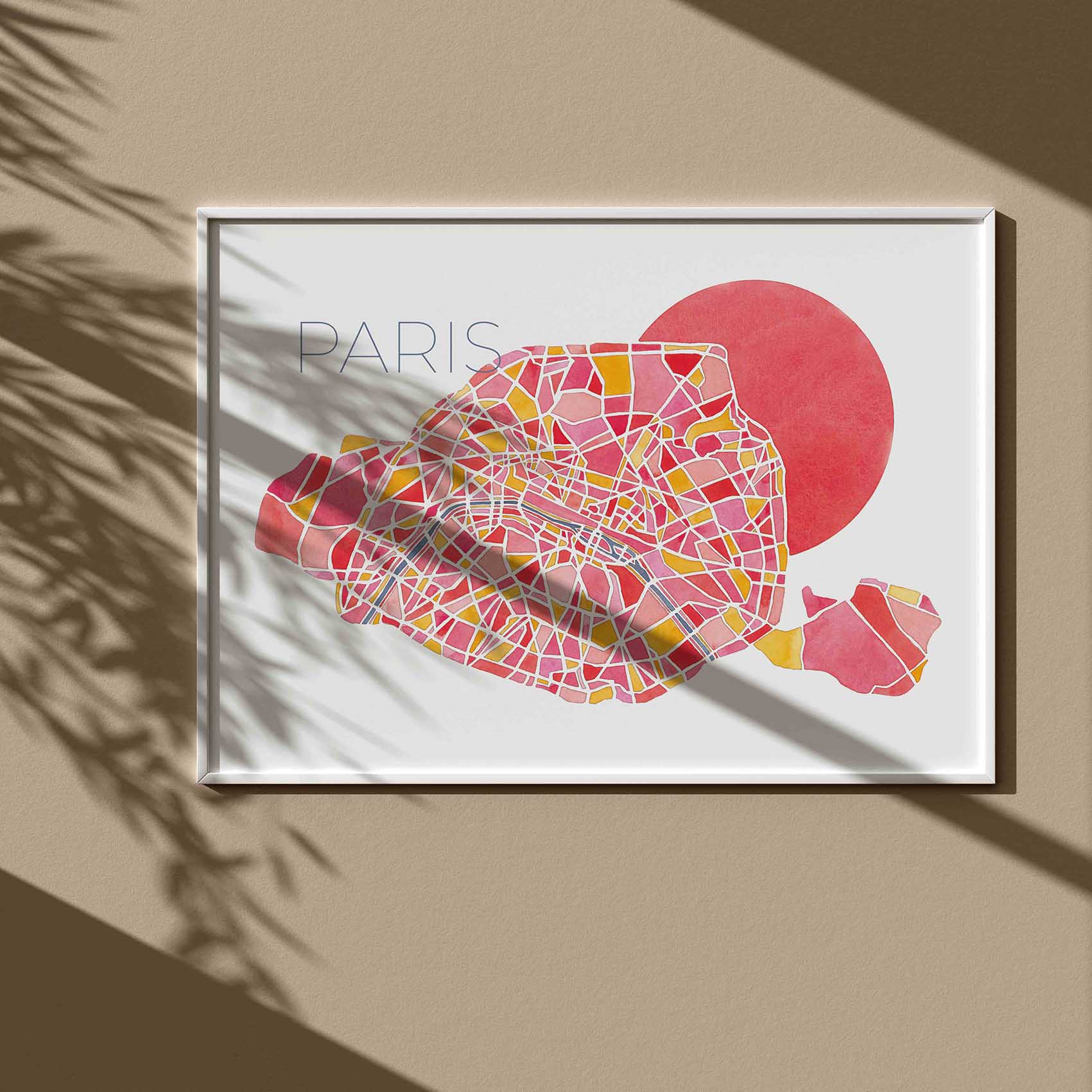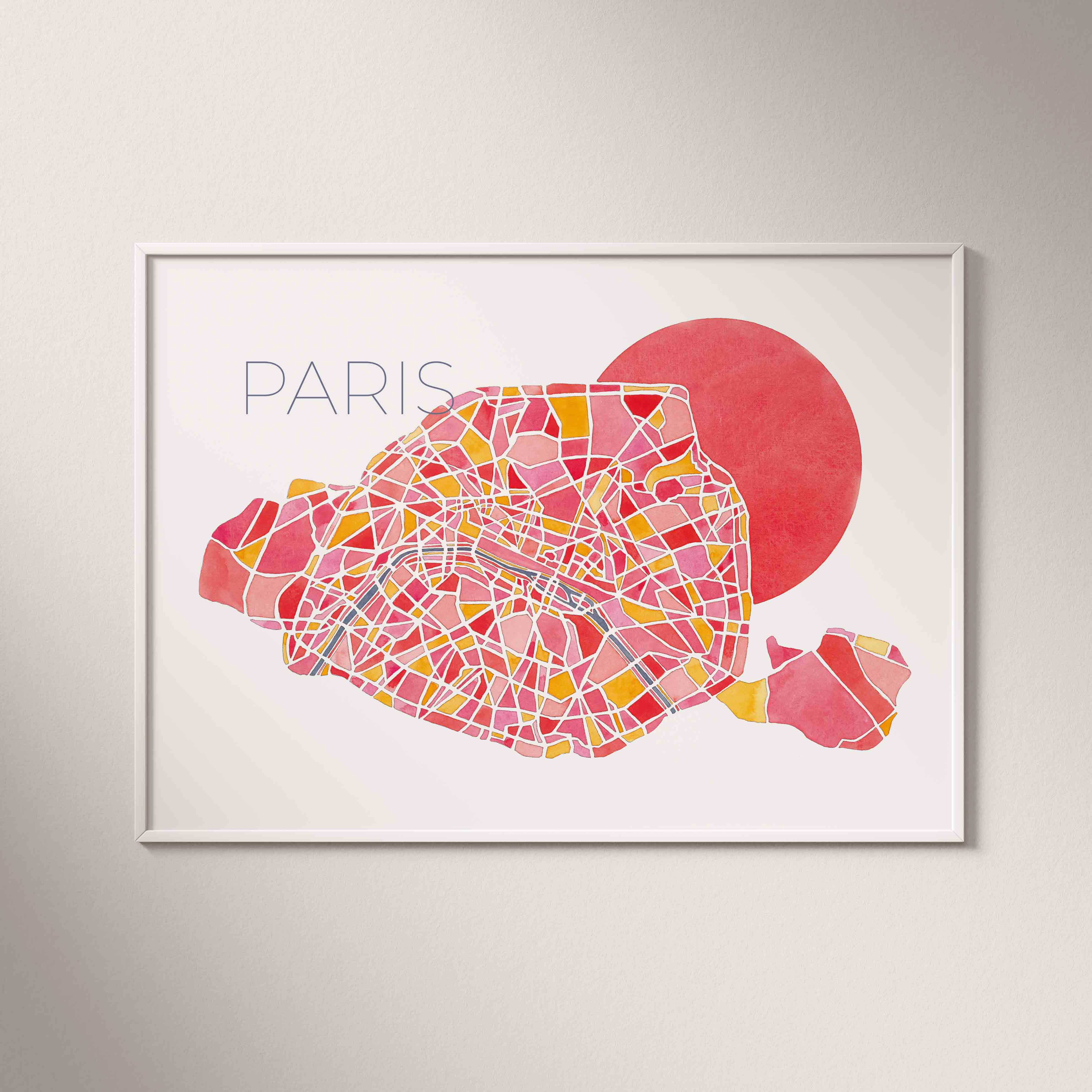 Un plan artistique de Paris, interprété dans une palette rose lumineuse. Peinte à la main à l’aquarelle, cette carte révèle la structure élégante de la capitale. Une manière originale et raffinée...