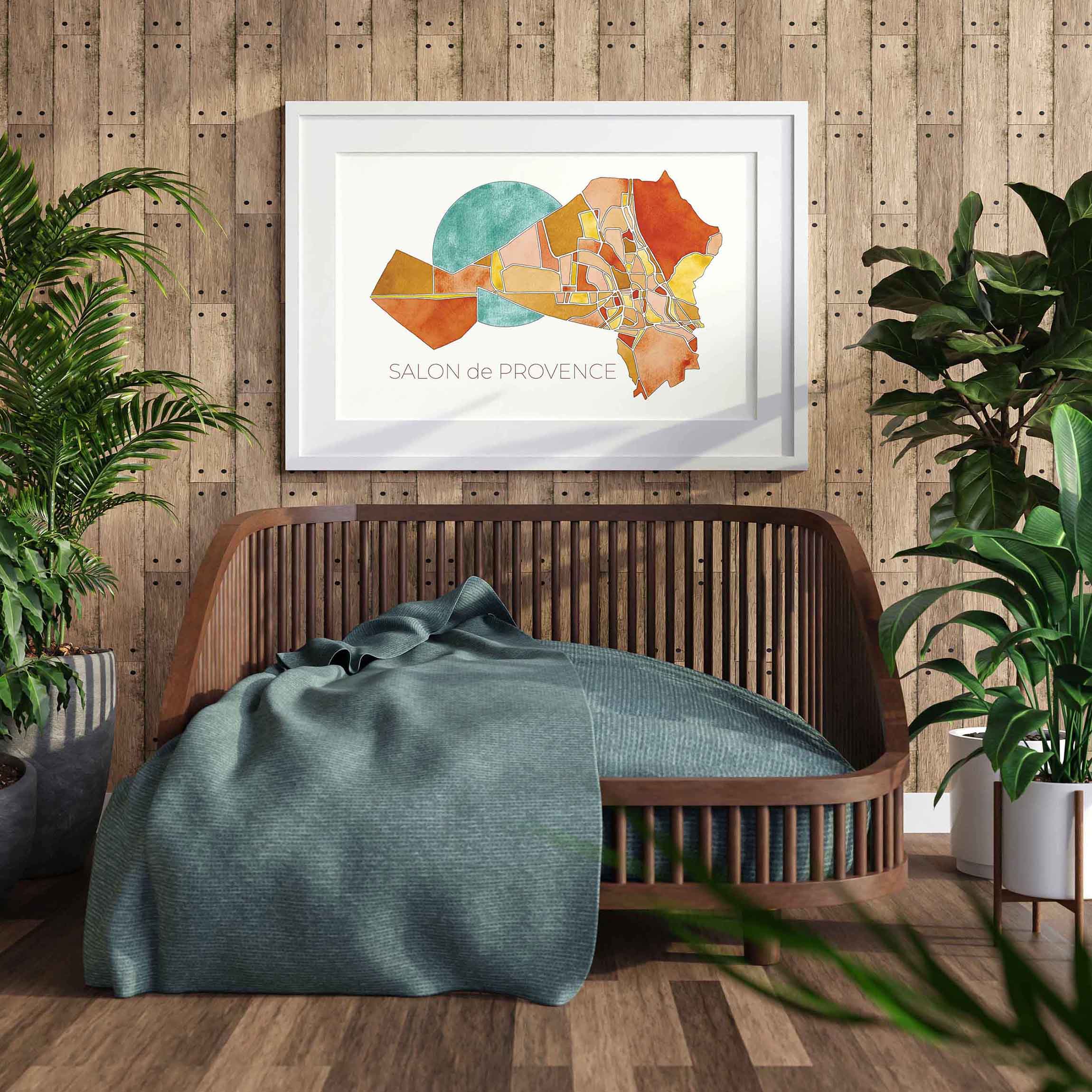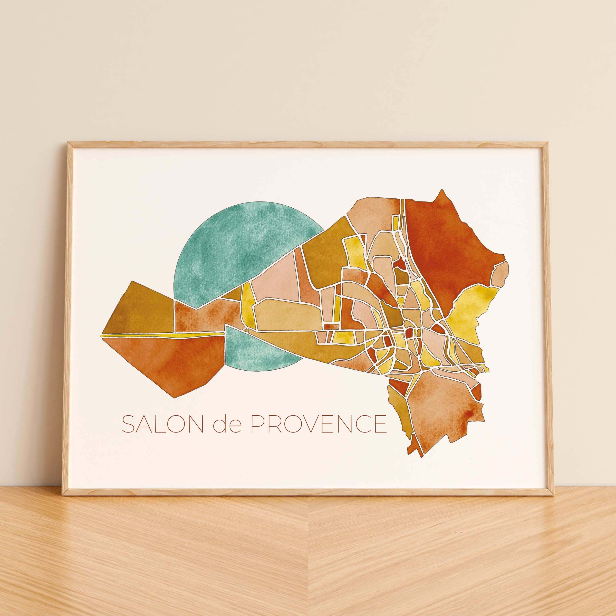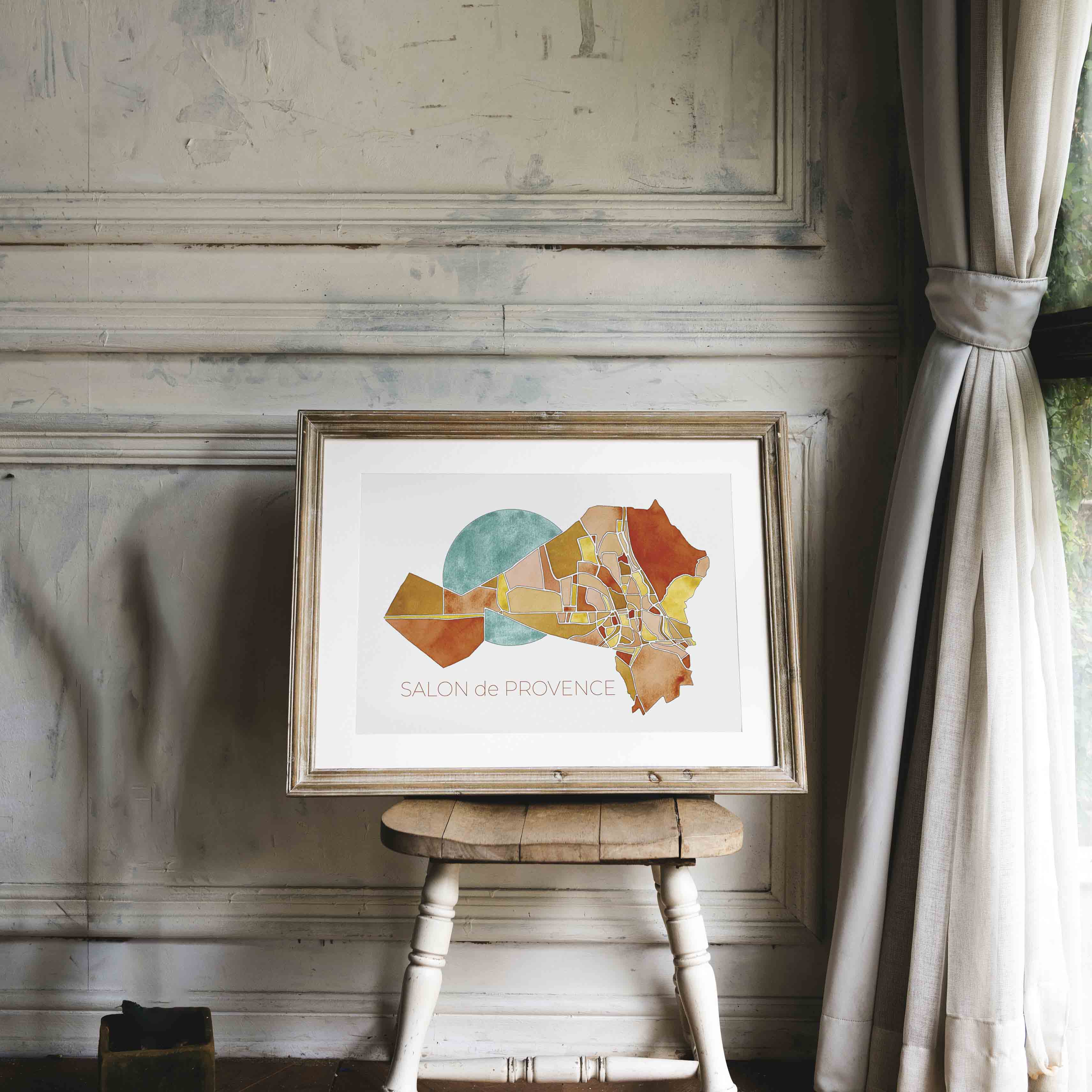 Un plan artistique de Salon-de-Provence, peint à la main à l’aquarelle. Cette carte met en lumière le territoire de la ville dans une interprétation chaleureuse et contemporaine. Une manière...