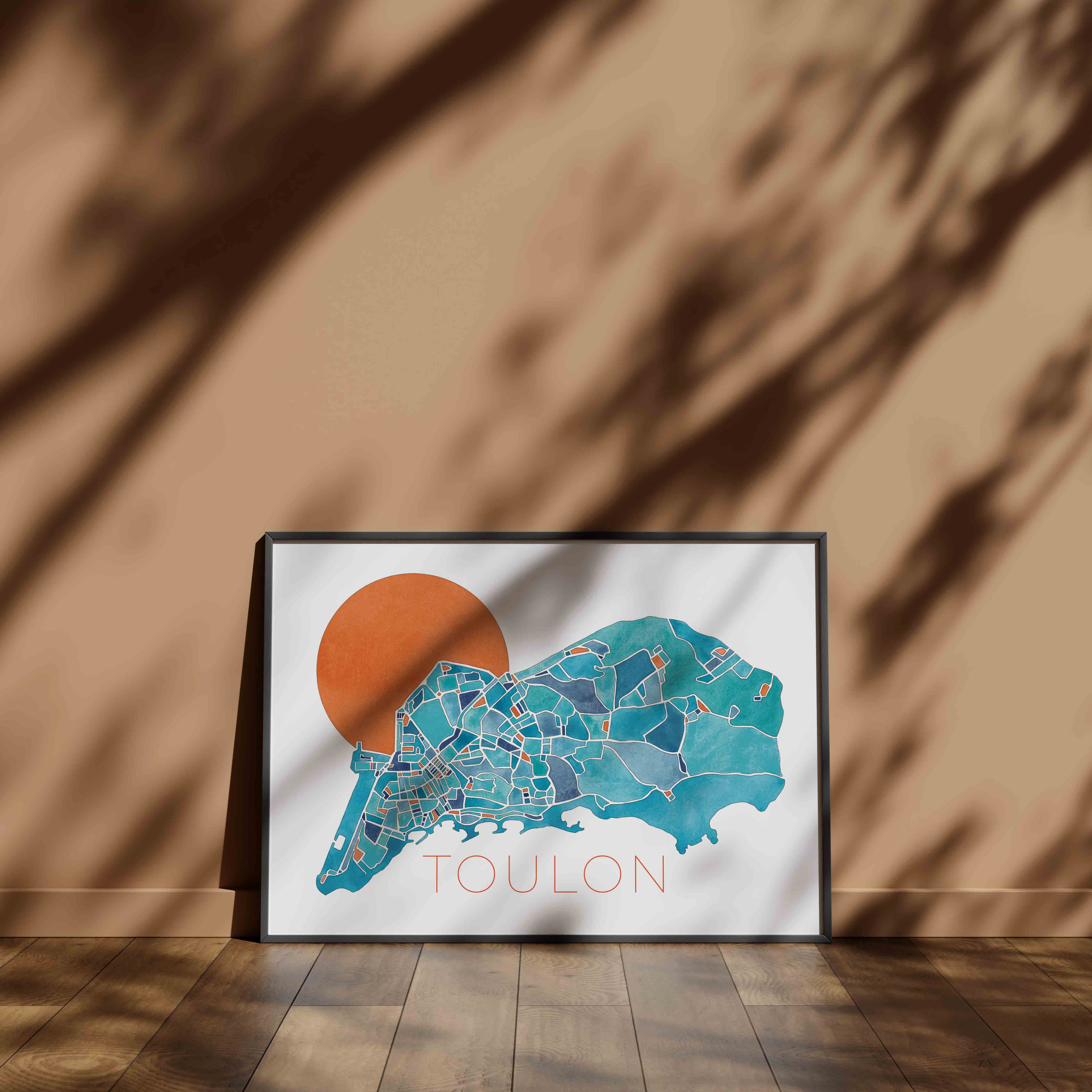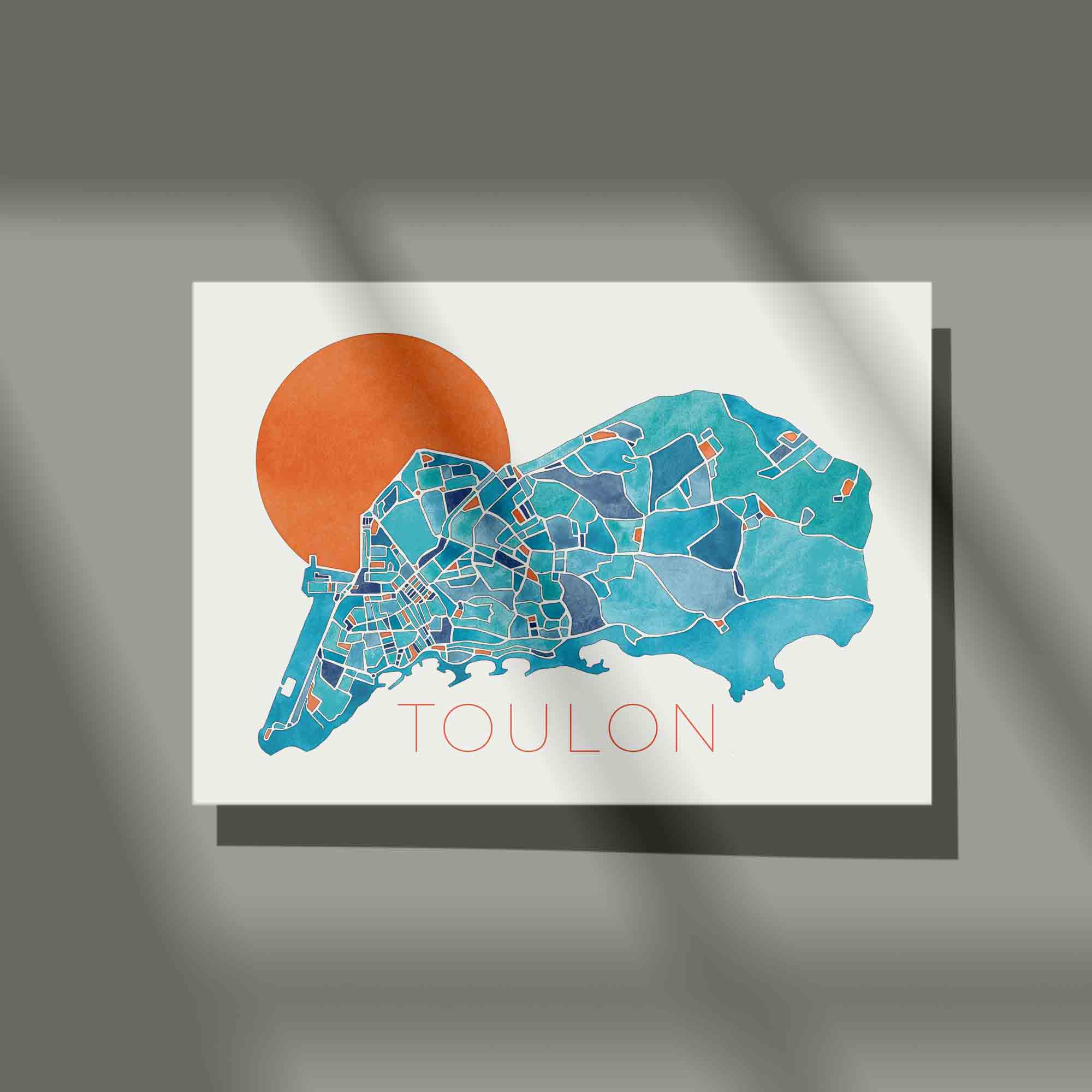 Un plan artistique de Toulon, des plages du Mourillon au Cap Brun. Peinte à la main à l’aquarelle, cette carte révèle l’équilibre entre rade, quartiers résidentiels et littoral méditerranéen. Une...