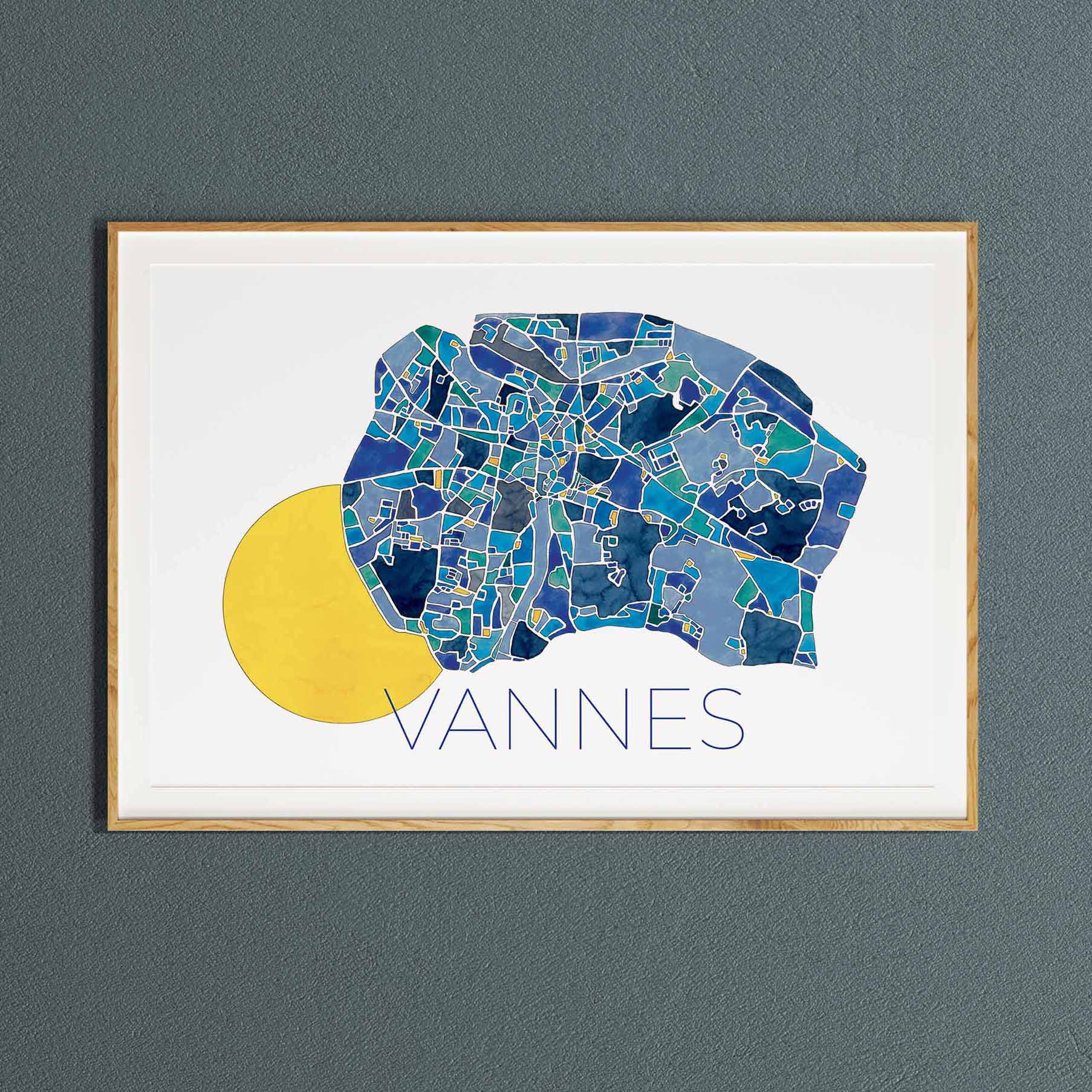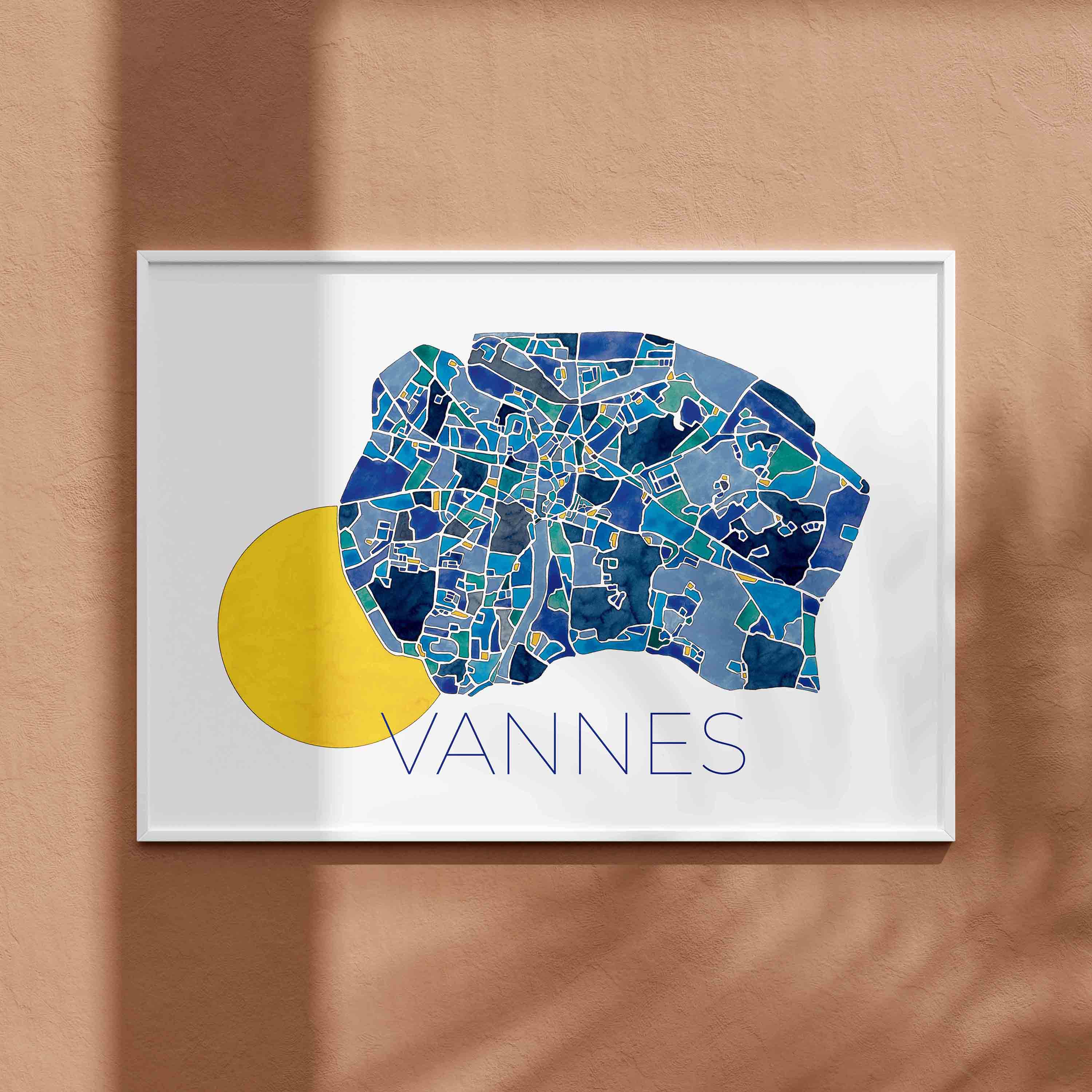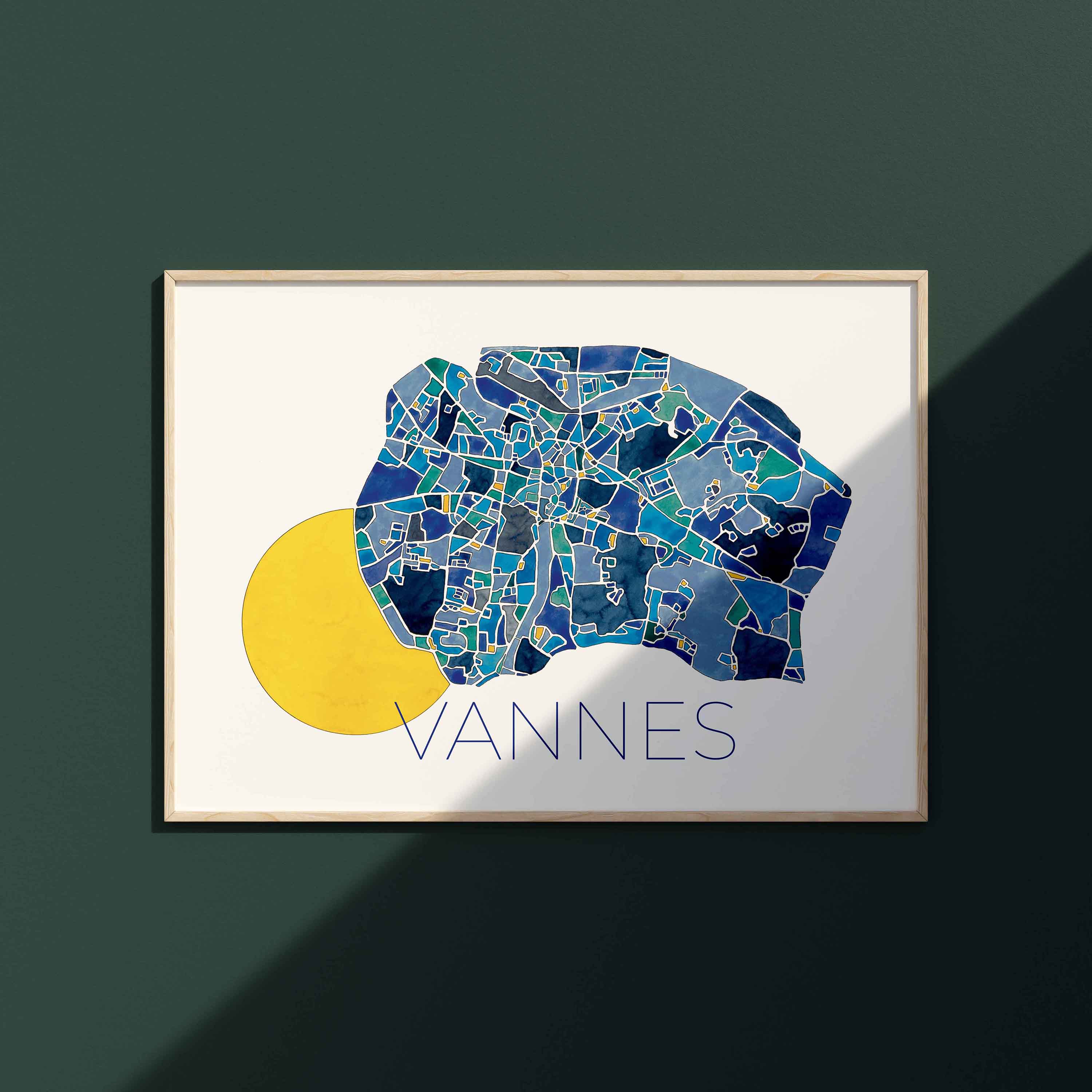 Un plan artistique de Vannes, entre port et cité médiévale. Peinte à la main à l’aquarelle, cette carte révèle l’élégance discrète de la ville bretonne. Une manière raffinée de représenter Vannes...