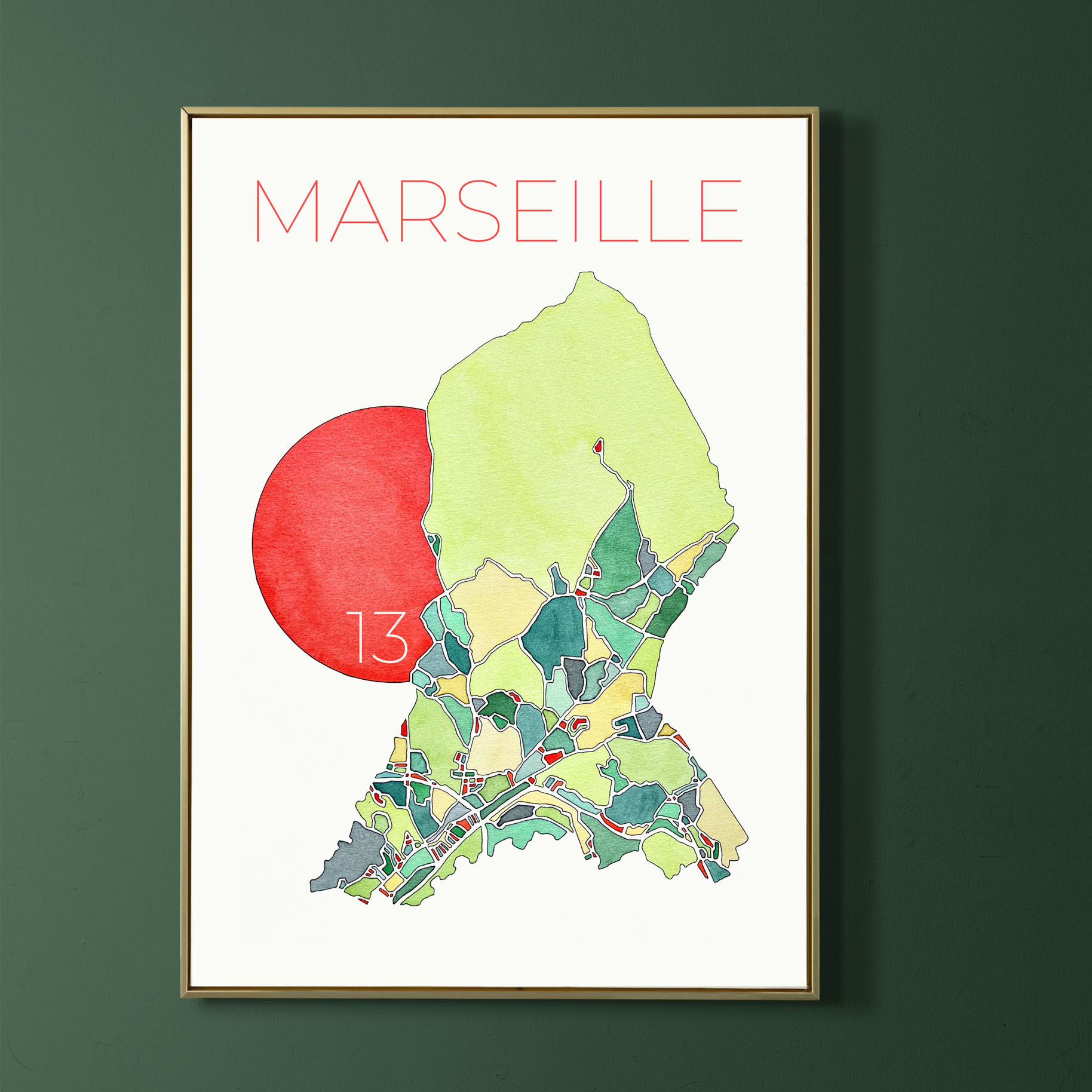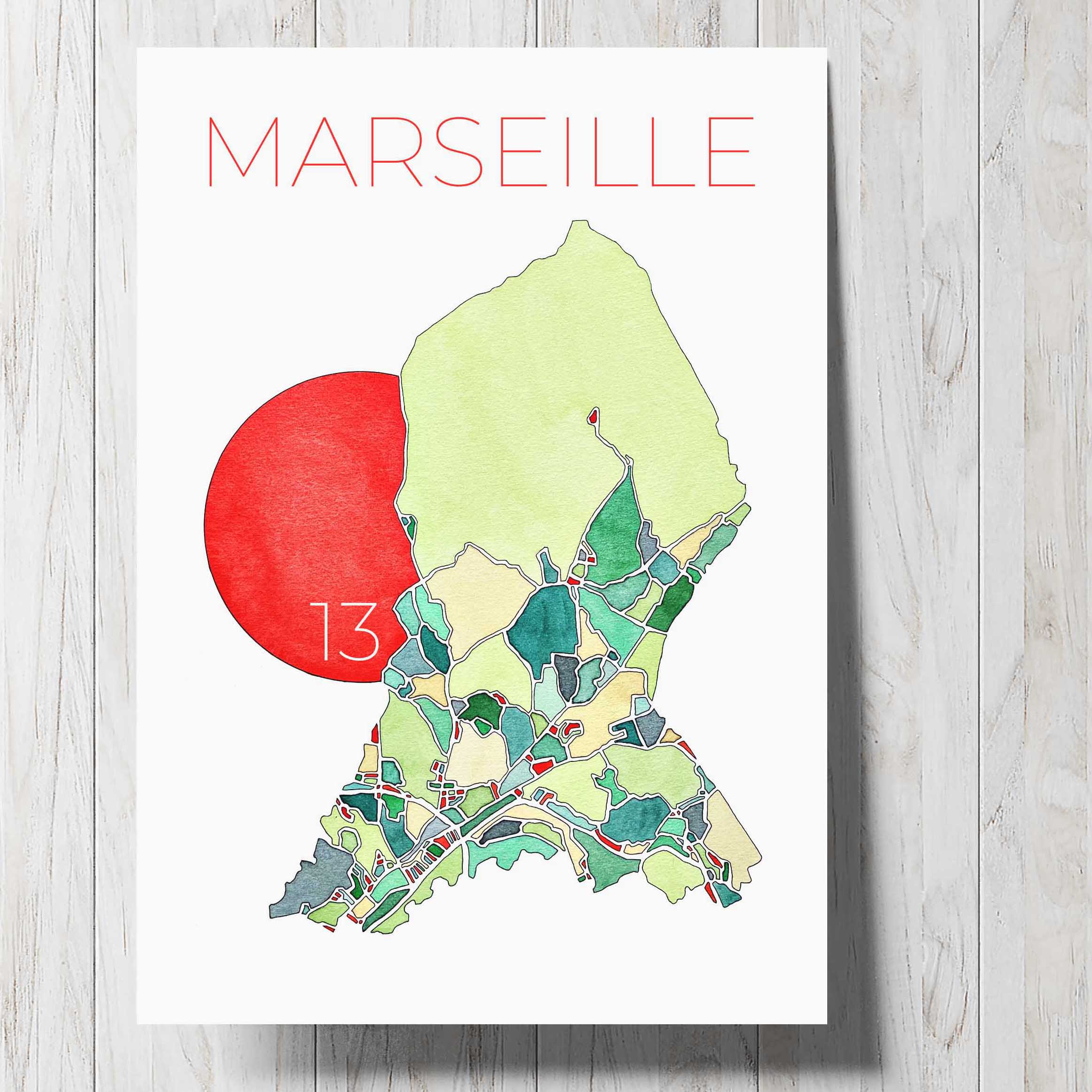 Un plan artistique du 13e arrondissement de Marseille, entre Château-Gombert et le Massif de l’Étoile. Peinte à la main à l’aquarelle, cette carte révèle un territoire contrasté, entre identité...
