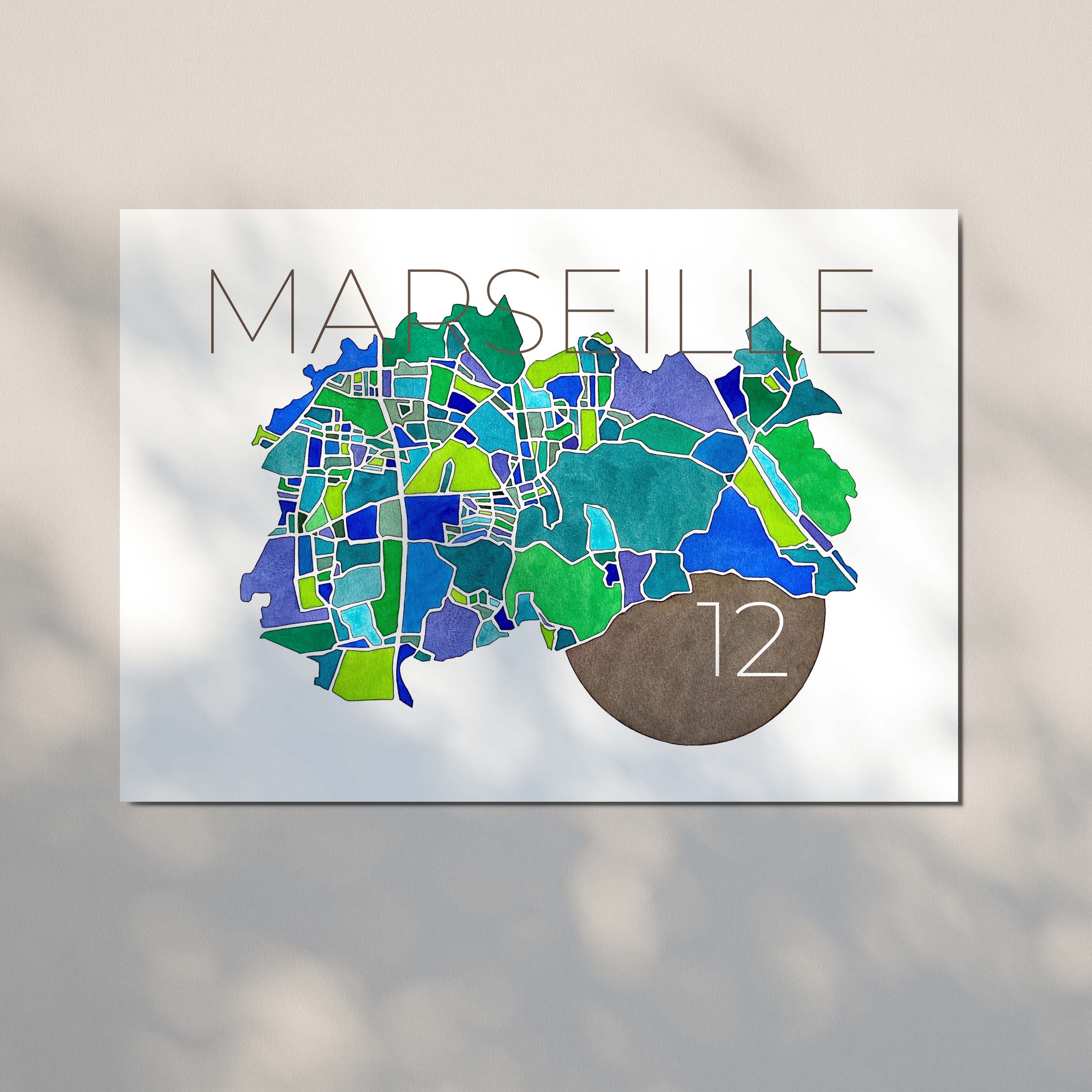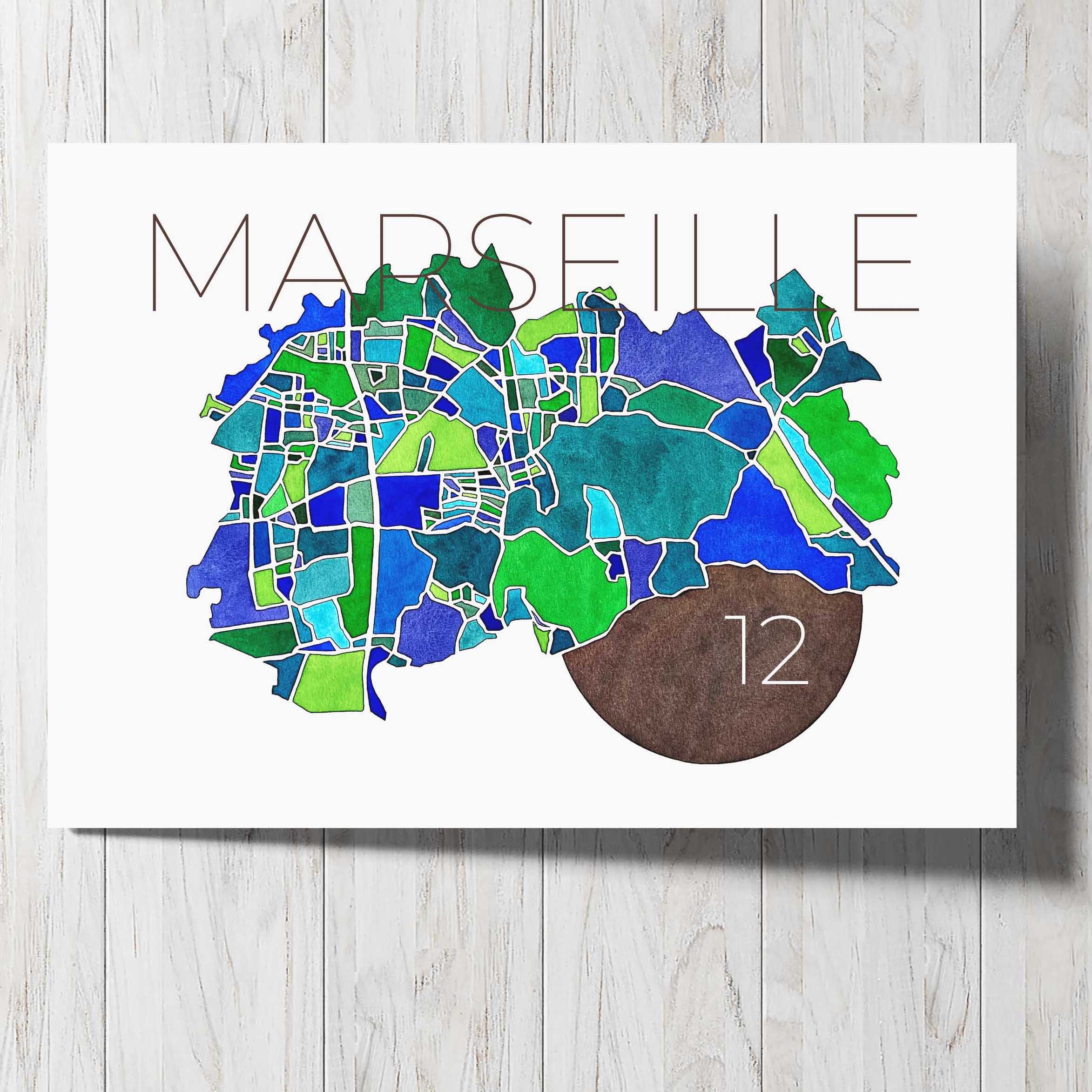 Un plan artistique du 12e arrondissement de Marseille, entre quartiers résidentiels et collines. Peinte à la main à l’aquarelle, cette carte révèle un territoire à l’identité paisible et...