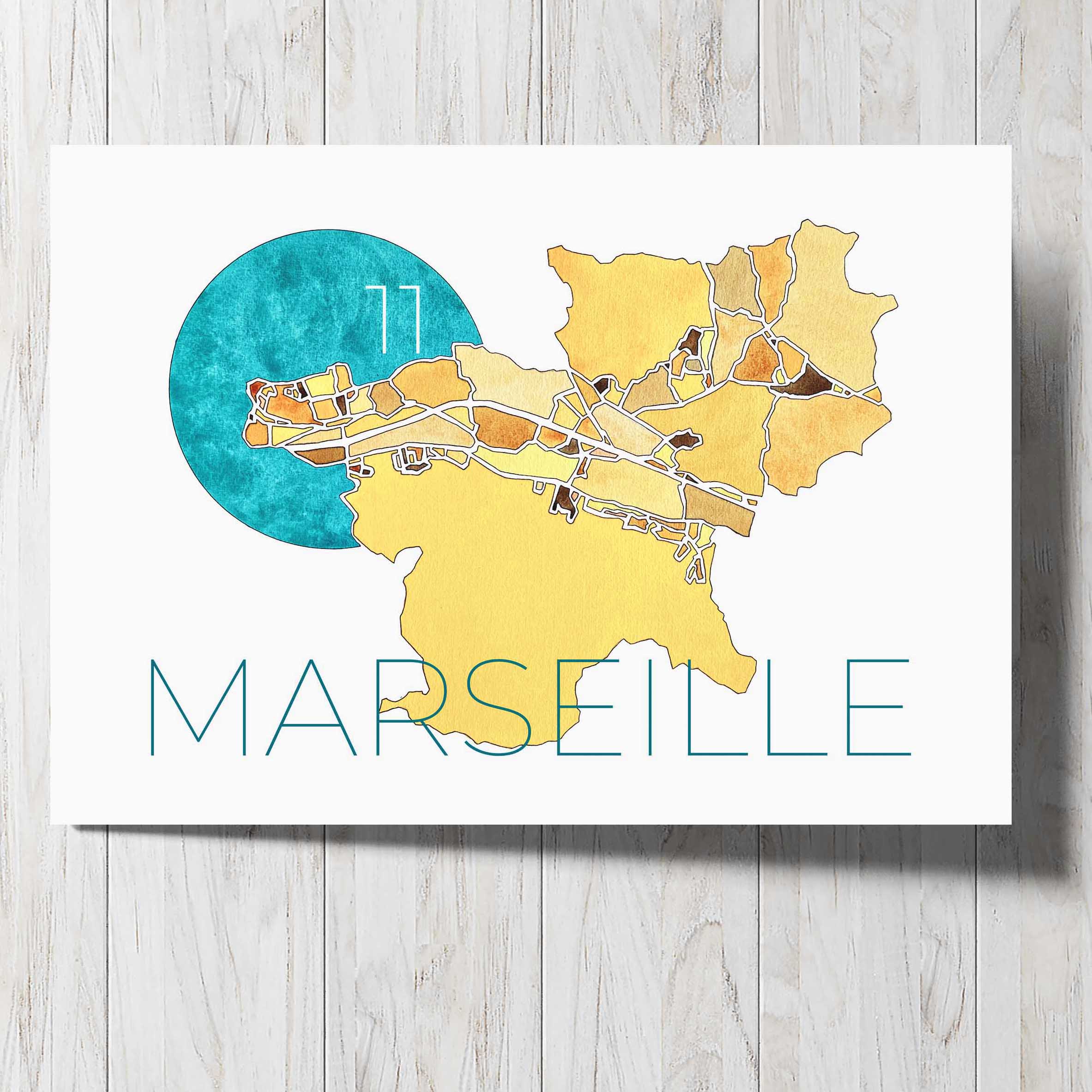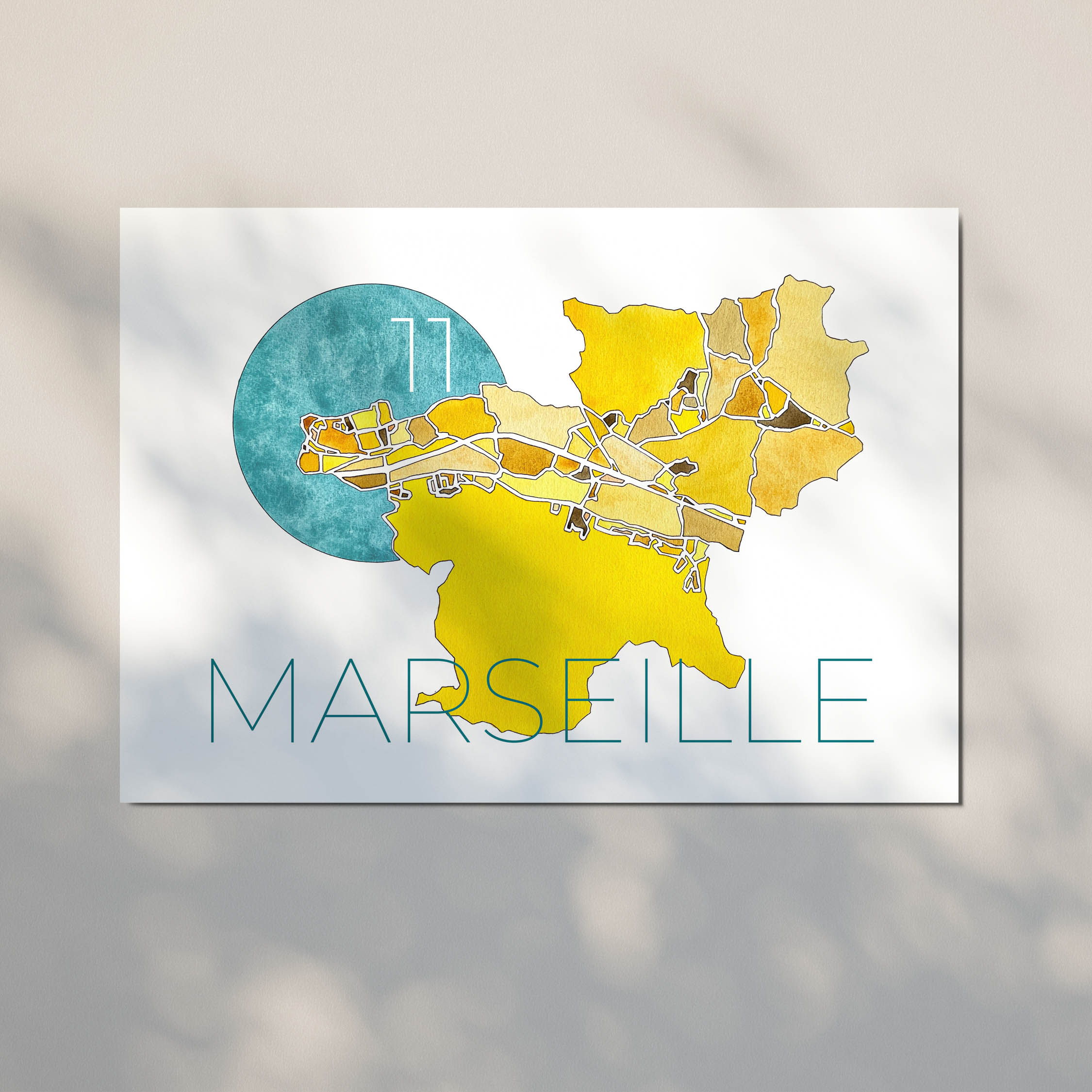 Un plan artistique du 11e arrondissement de Marseille, entre collines et lumière. Peinte à la main à l’aquarelle, cette carte révèle un territoire vaste, marqué par la nature et les reliefs. Une...