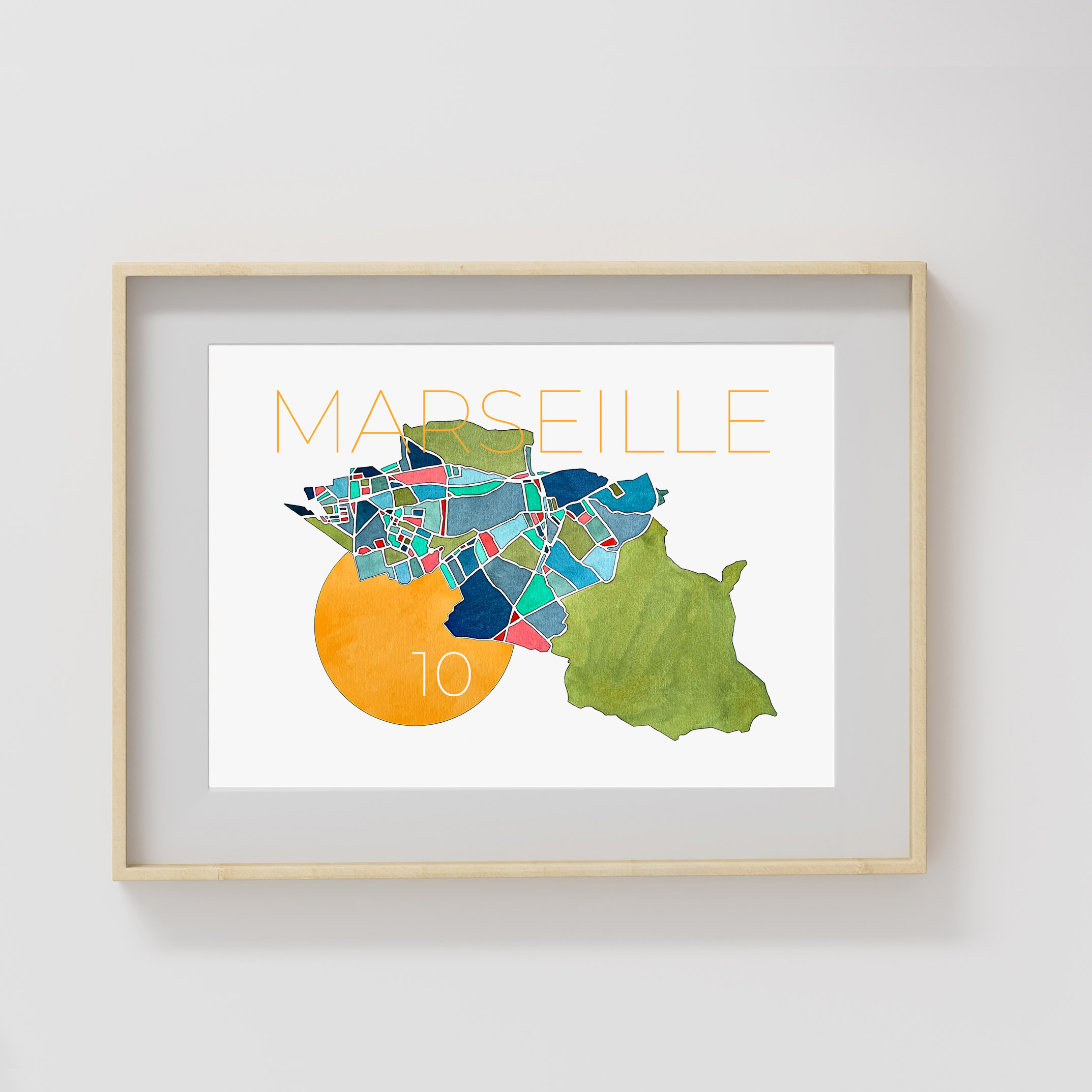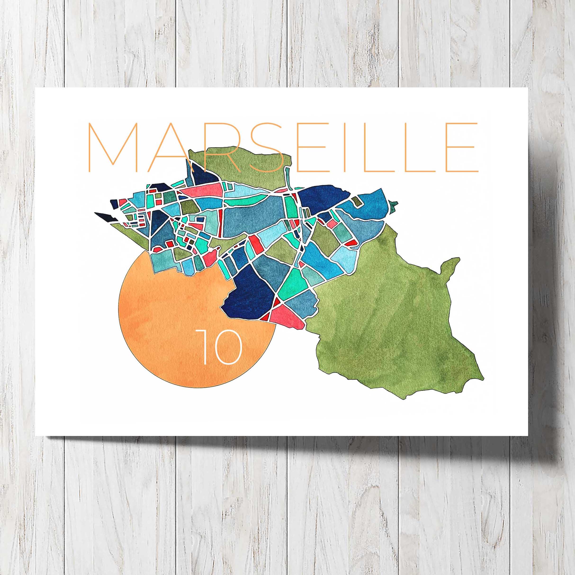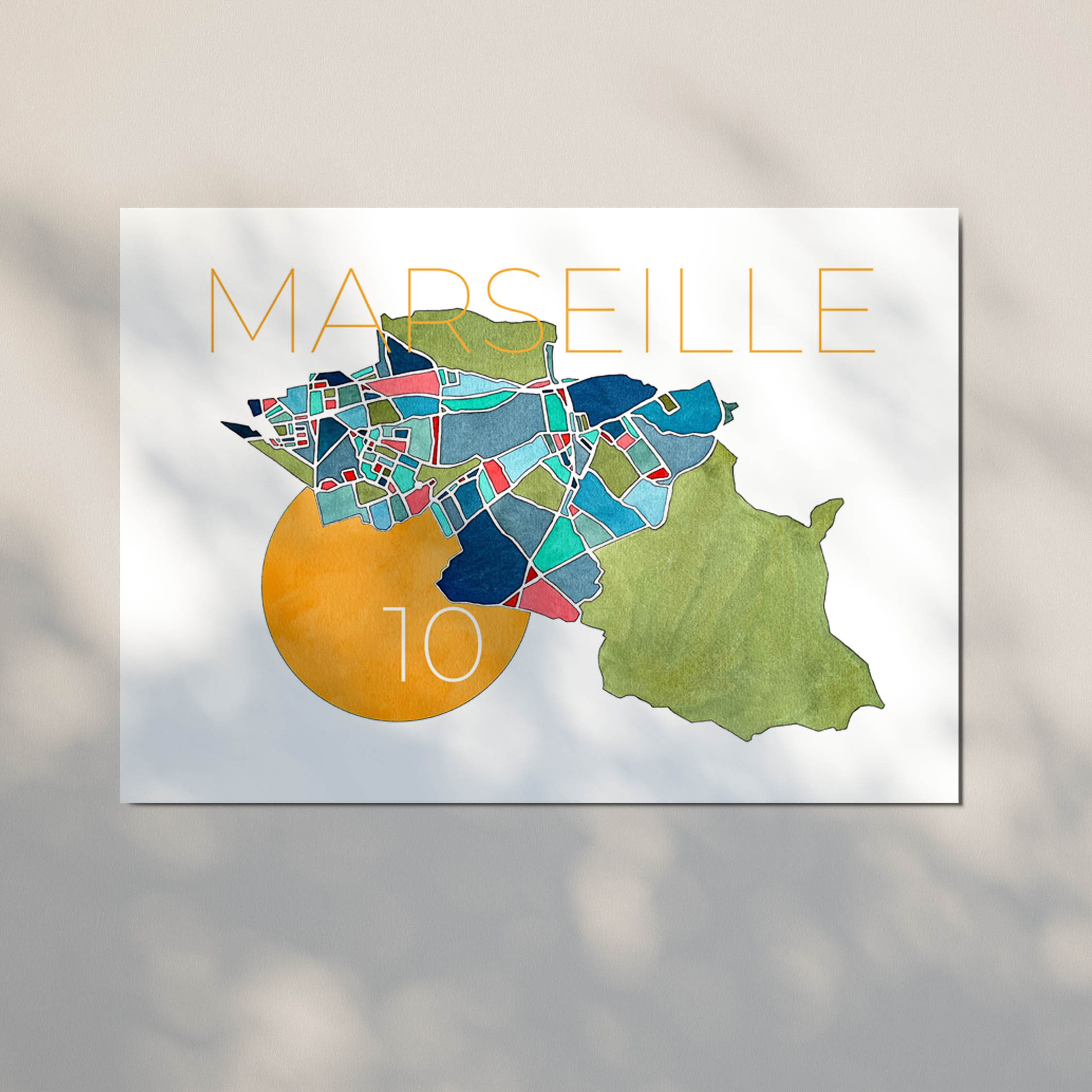 Un plan artistique du 10e arrondissement de Marseille, entre ville et respiration végétale. Peinte à la main à l’aquarelle, cette carte révèle un territoire de transition, à la croisée des axes...