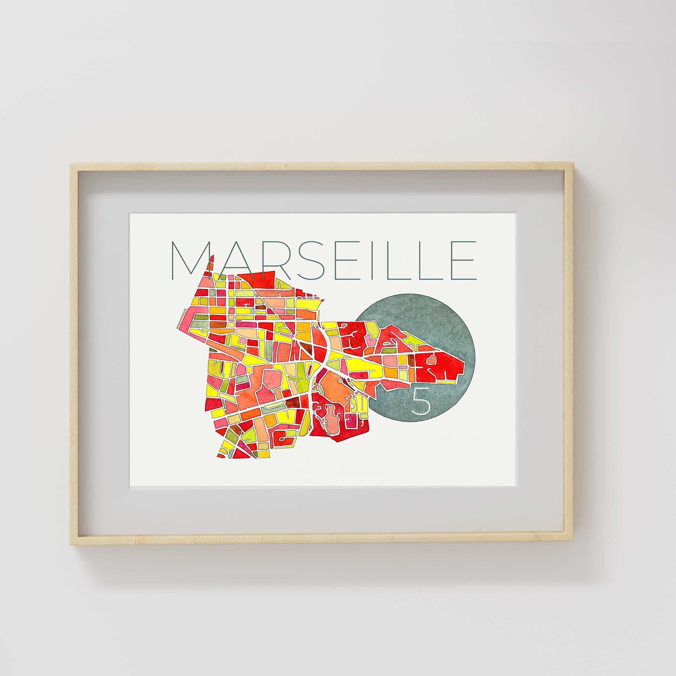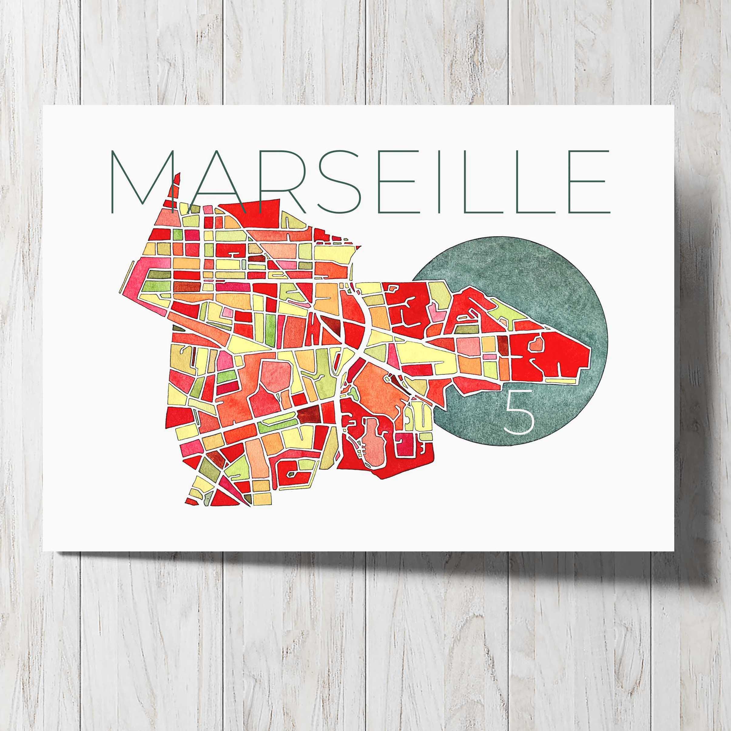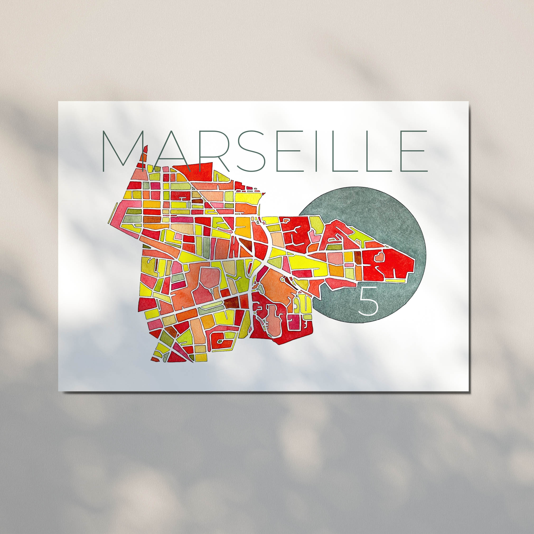 Un plan artistique du 5e arrondissement de Marseille, de La Plaine au Cours Julien. Peinte à la main à l’aquarelle, cette carte révèle un quartier dense et solaire. Une interprétation graphique...
