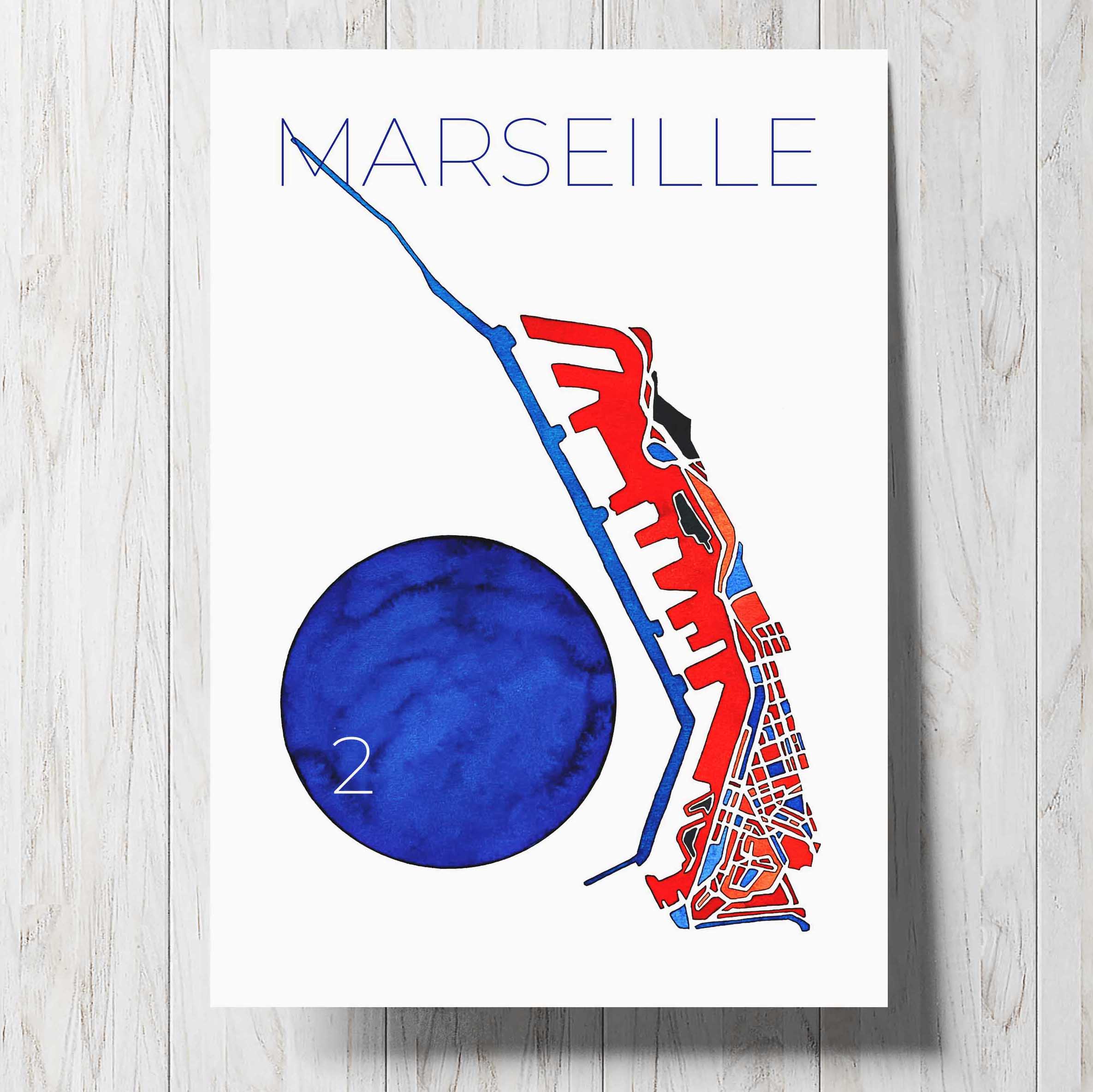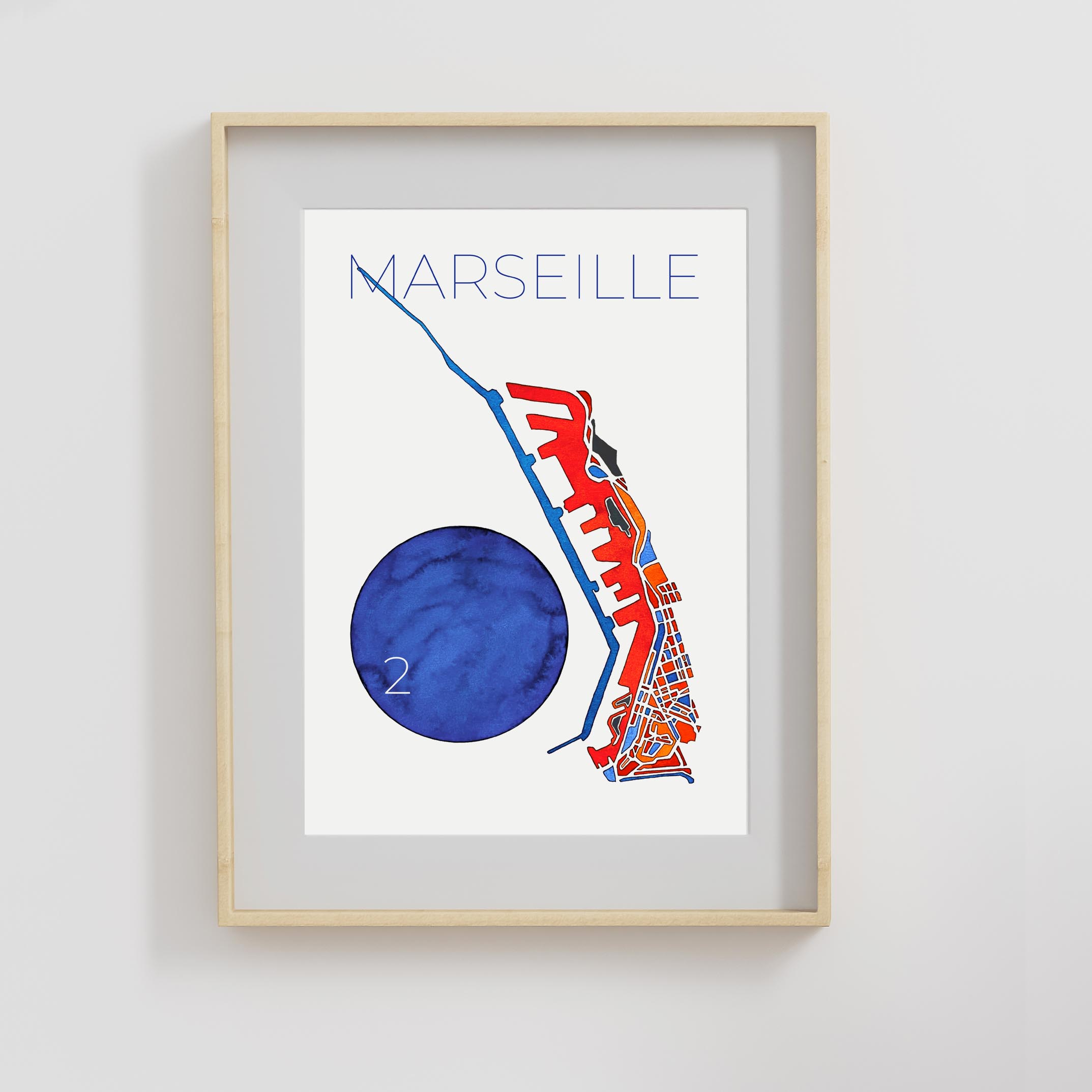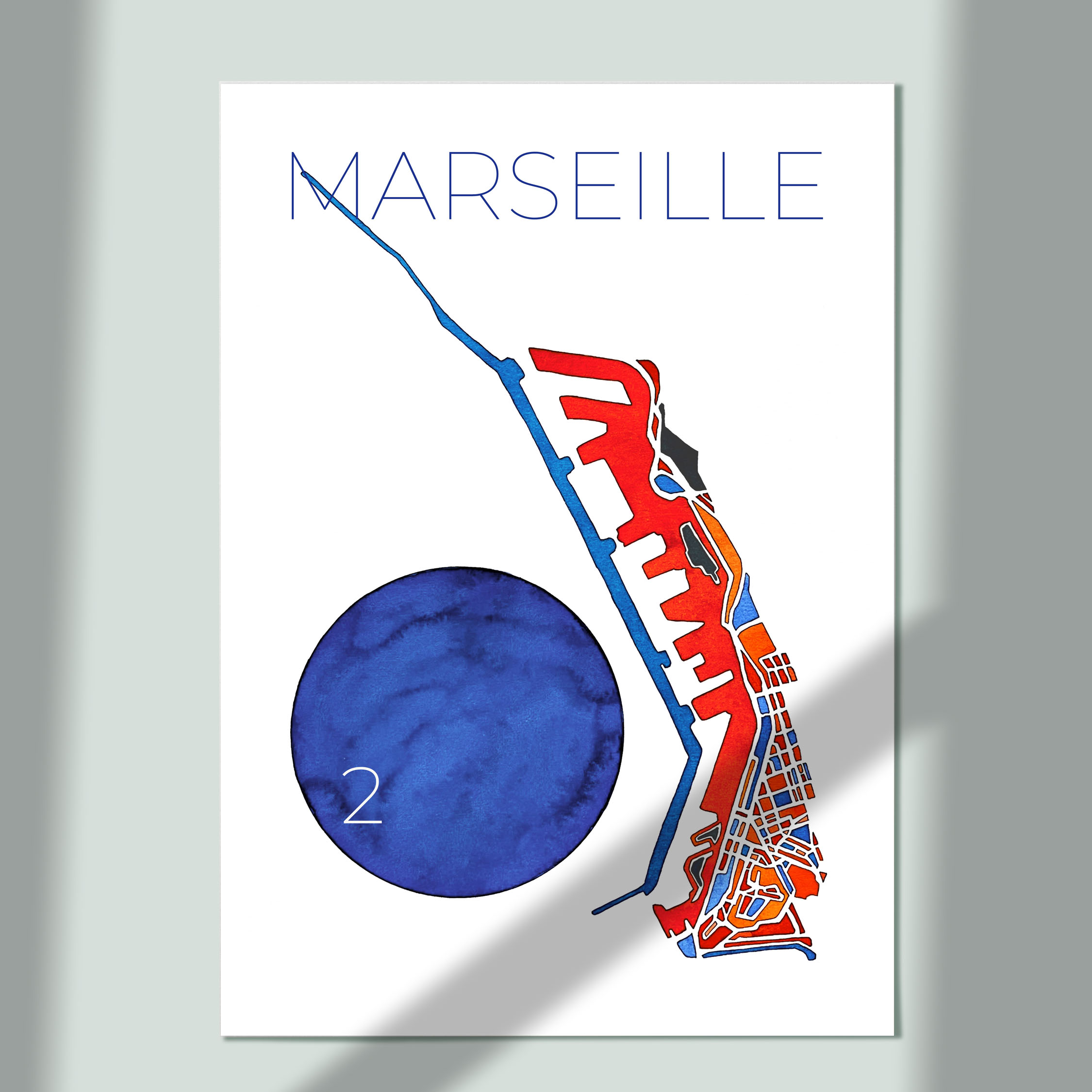 Un plan artistique du 2e arrondissement de Marseille, du Vieux-Port à la Joliette. Peinte à la main à l’aquarelle, cette carte affirme de forts contrastes, entre patrimoine ancien et architecture...