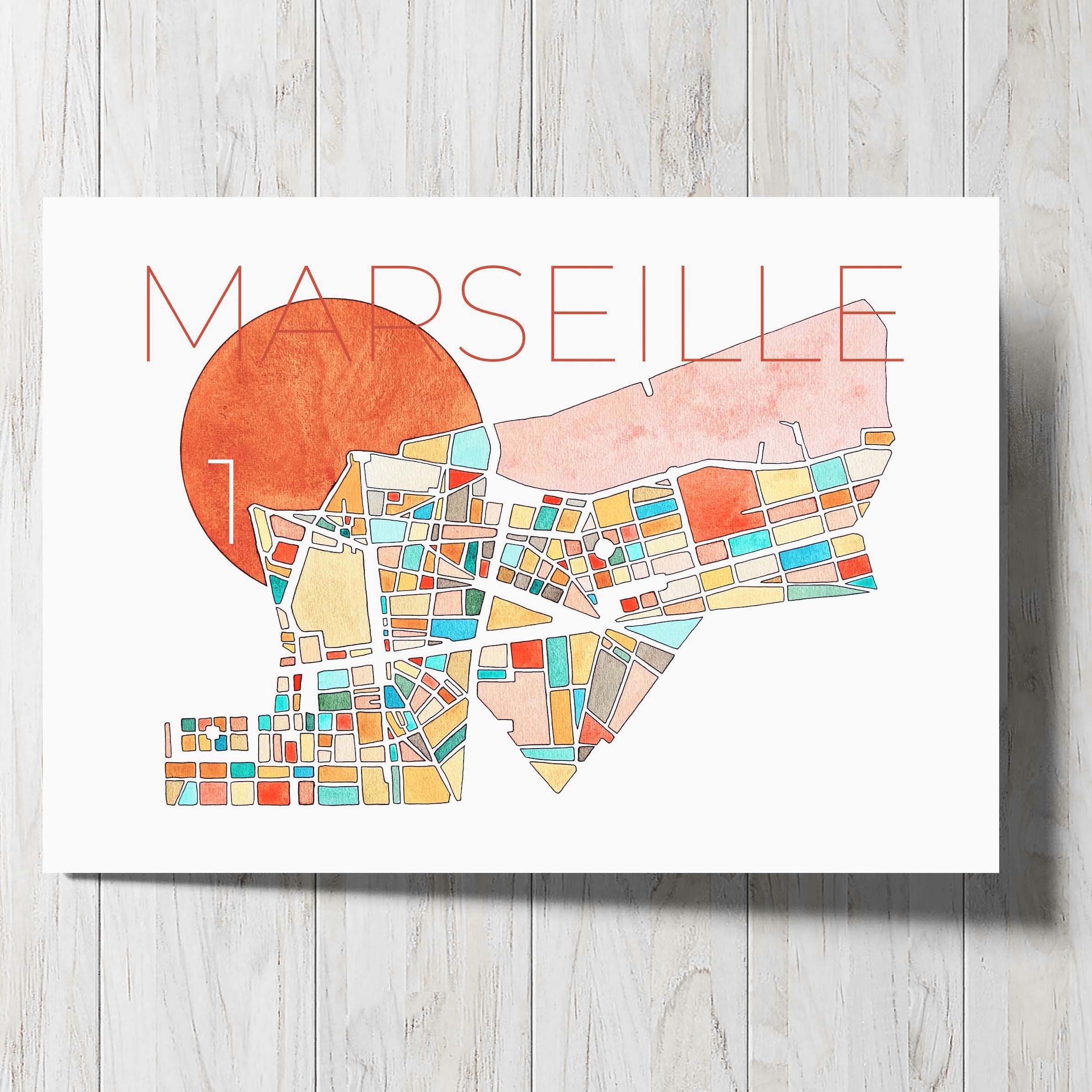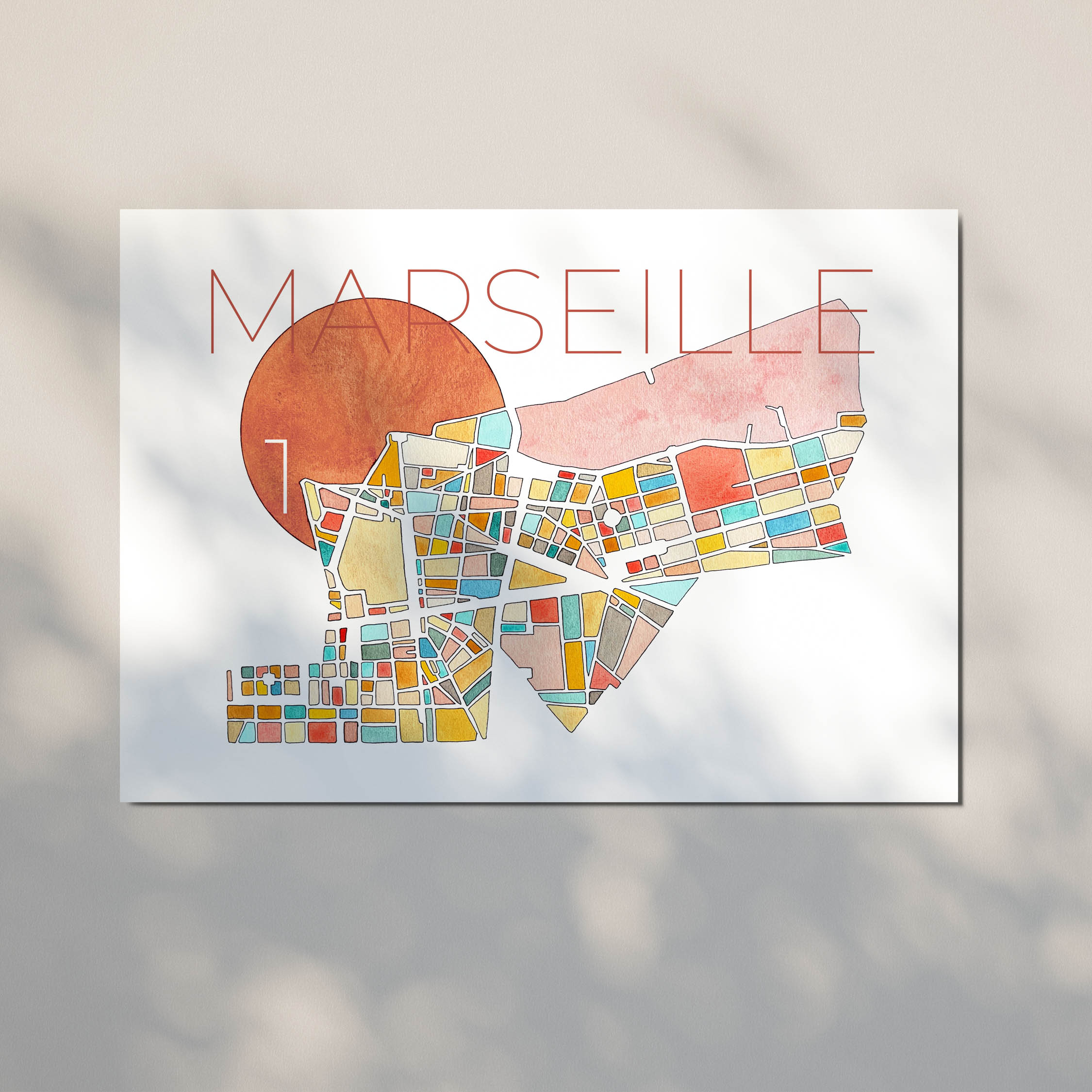 Un plan artistique du 1er arrondissement de Marseille, du Vieux-Port à Noailles. Peinte à la main à l’aquarelle, cette carte révèle le cœur historique et vivant de la cité phocéenne. Une manière...
