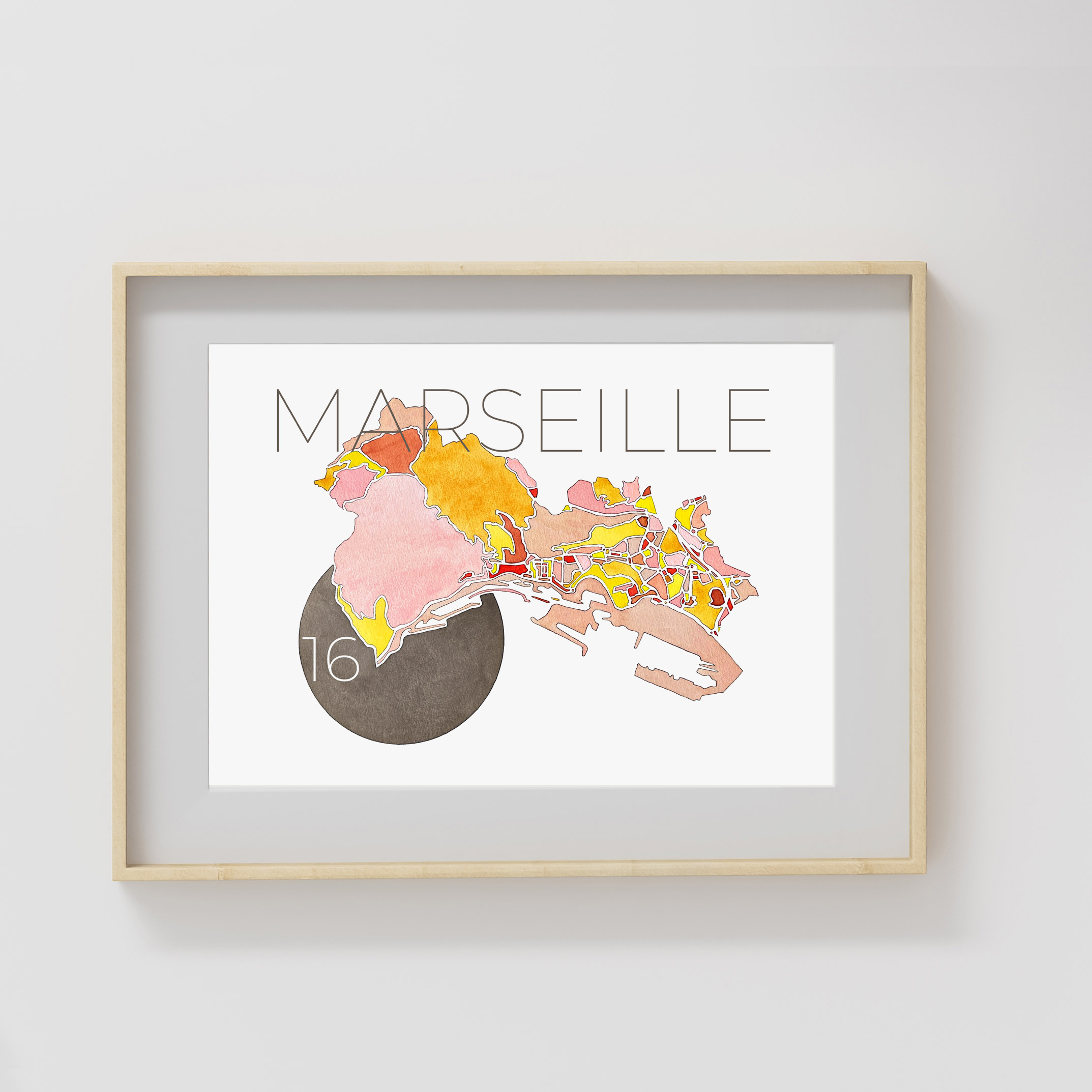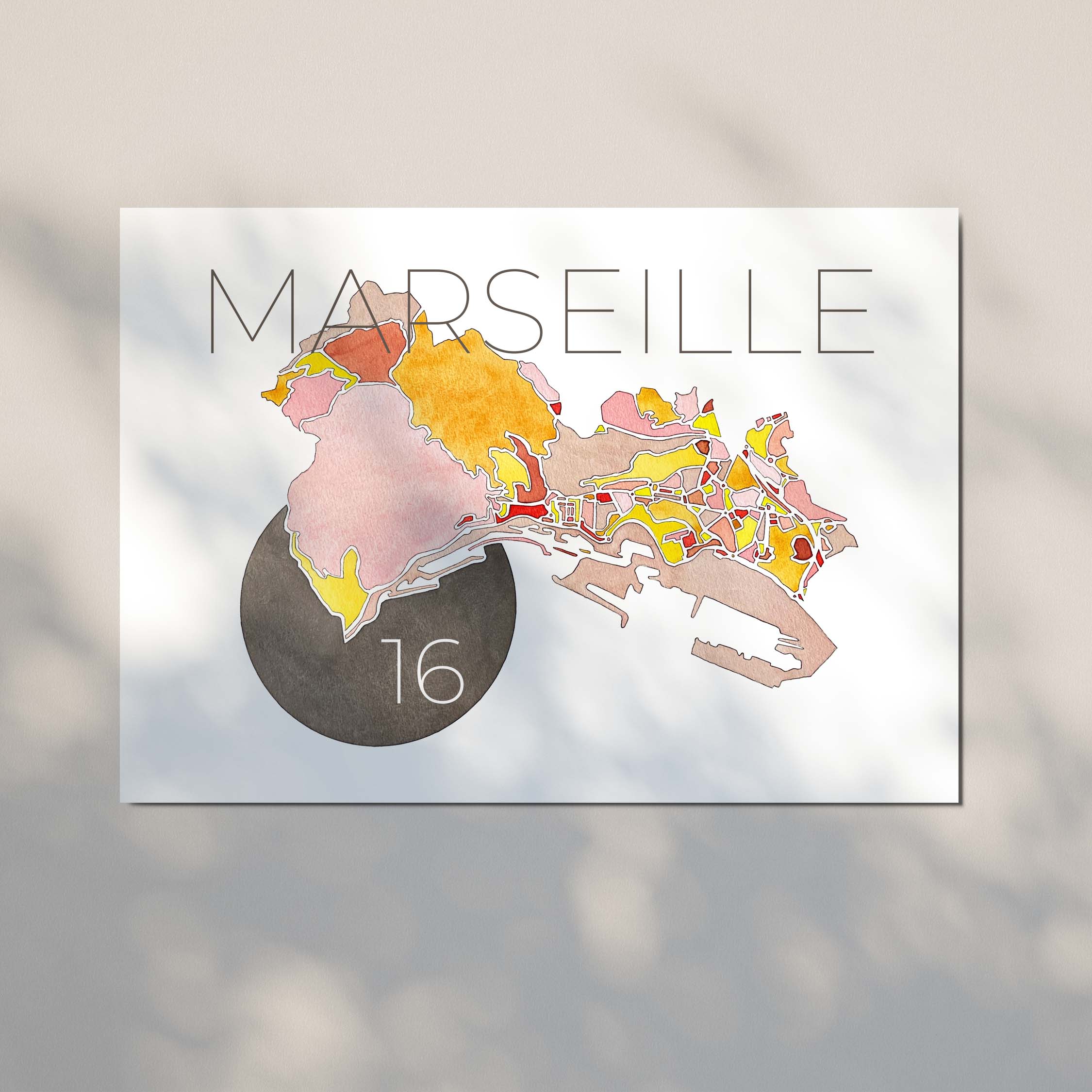 Un plan artistique du 16e arrondissement de Marseille, entre L’Estaque et le littoral. Peinte à la main à l’aquarelle, cette carte révèle un territoire aux toits rouges posé face à la mer. Une...