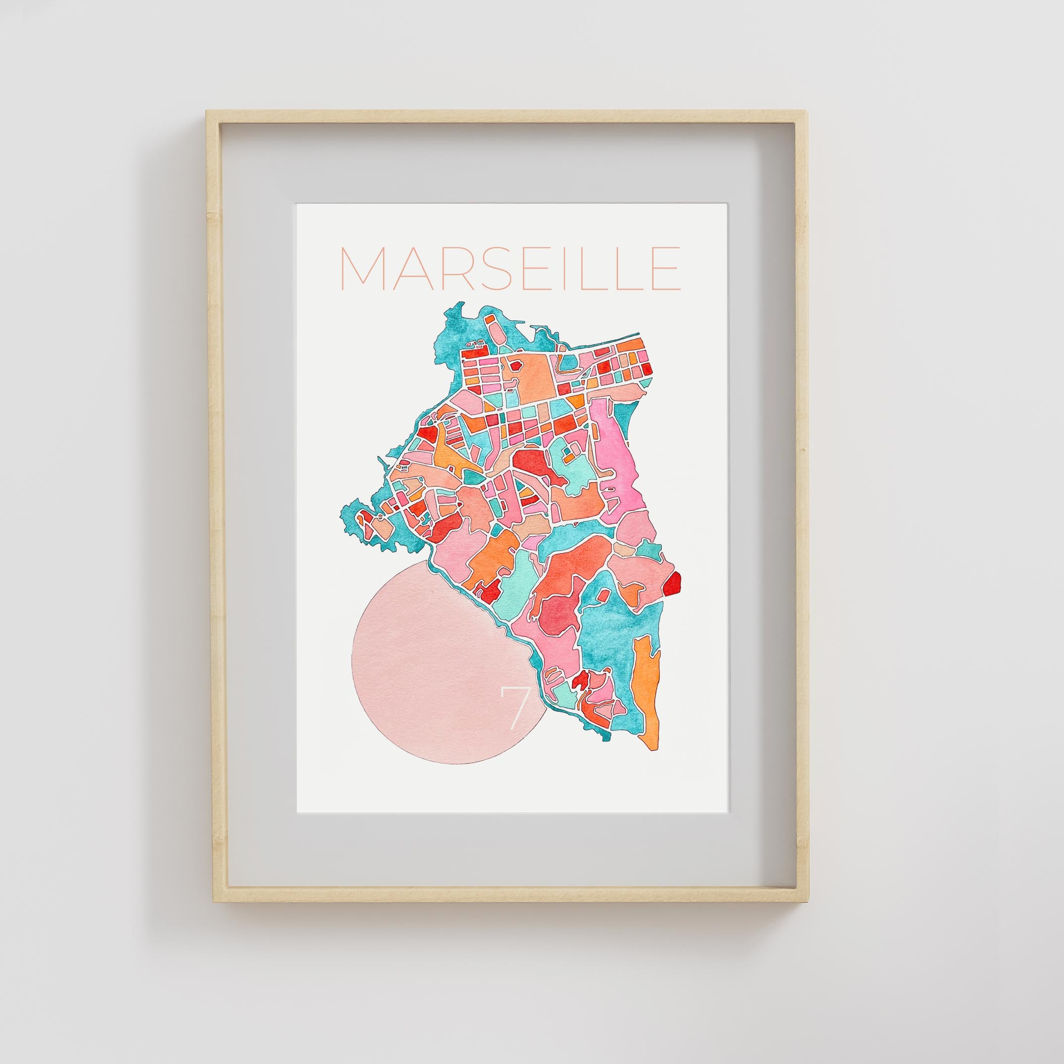 Un plan artistique du 8e arrondissement de Marseille, face à la mer. Peinte à la main à l’aquarelle, cette carte révèle un territoire largement ouvert sur le littoral méditerranéen. Une...