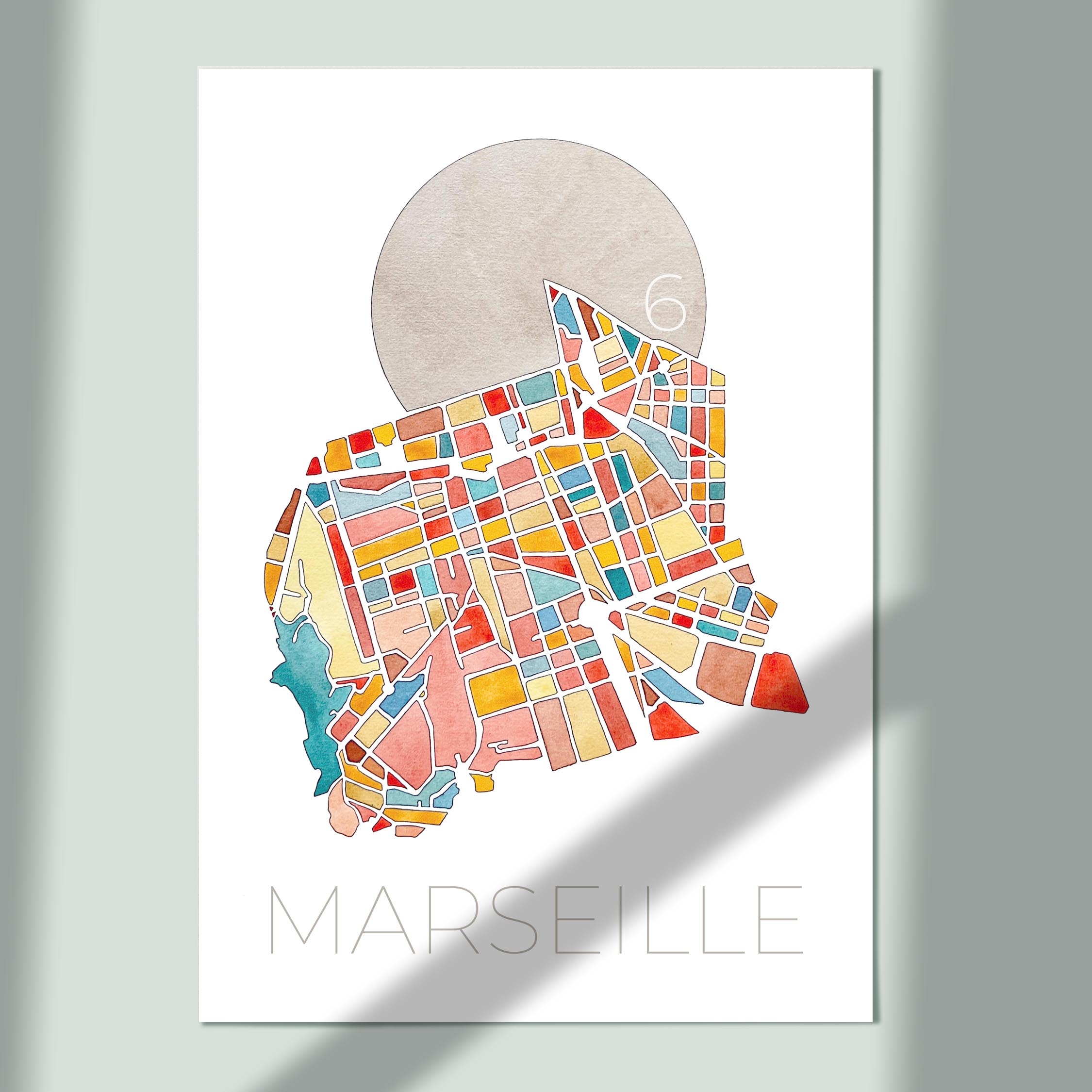 Un plan artistique du 6e arrondissement de Marseille, du Cours Julien à Notre-Dame de la Garde. Peinte à la main à l’aquarelle, cette carte révèle un quartier structuré et contrasté, entre...