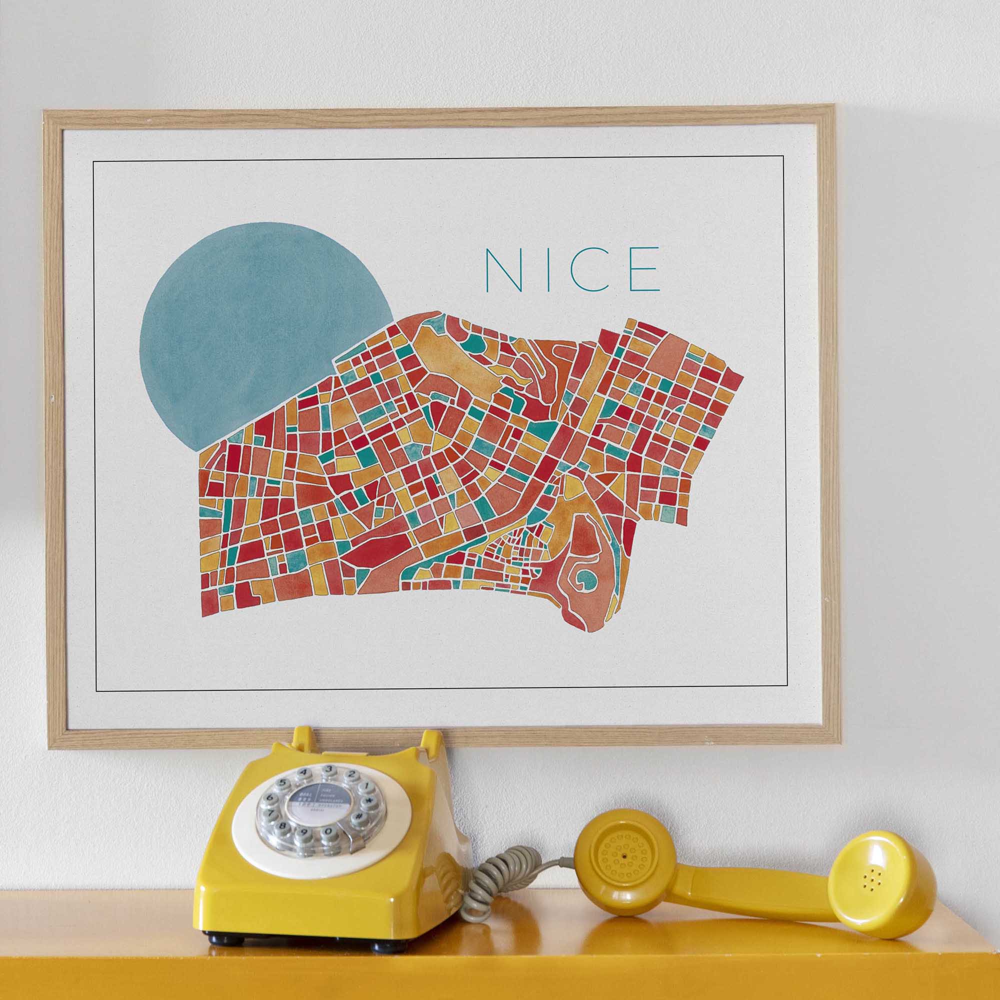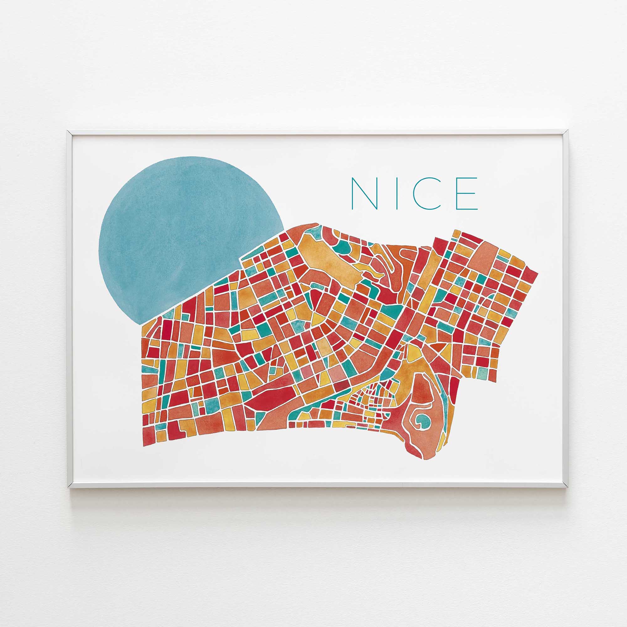 Peinte à la main à l’aquarelle, cette carte révèle la singularité colorée de la ville azuréenne.