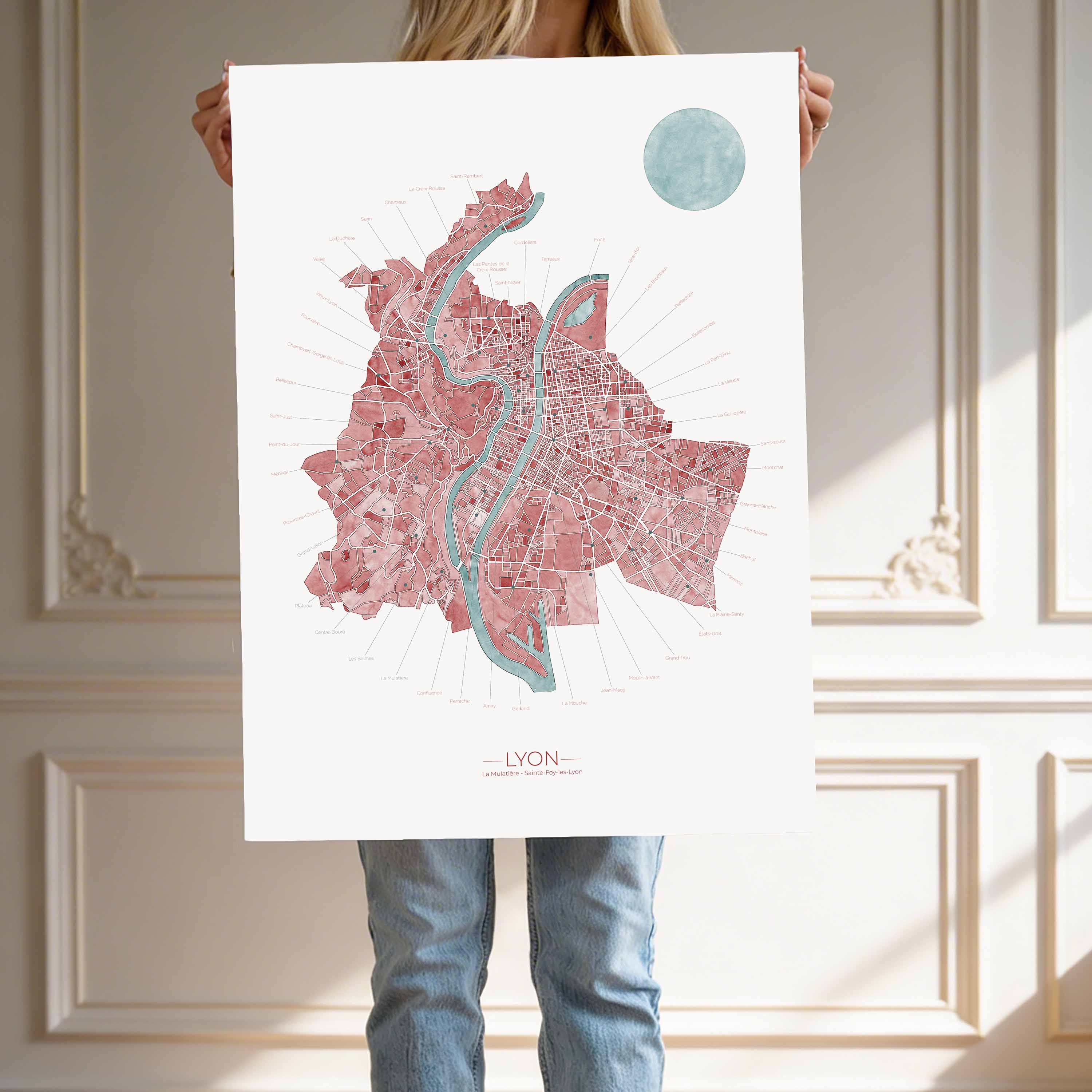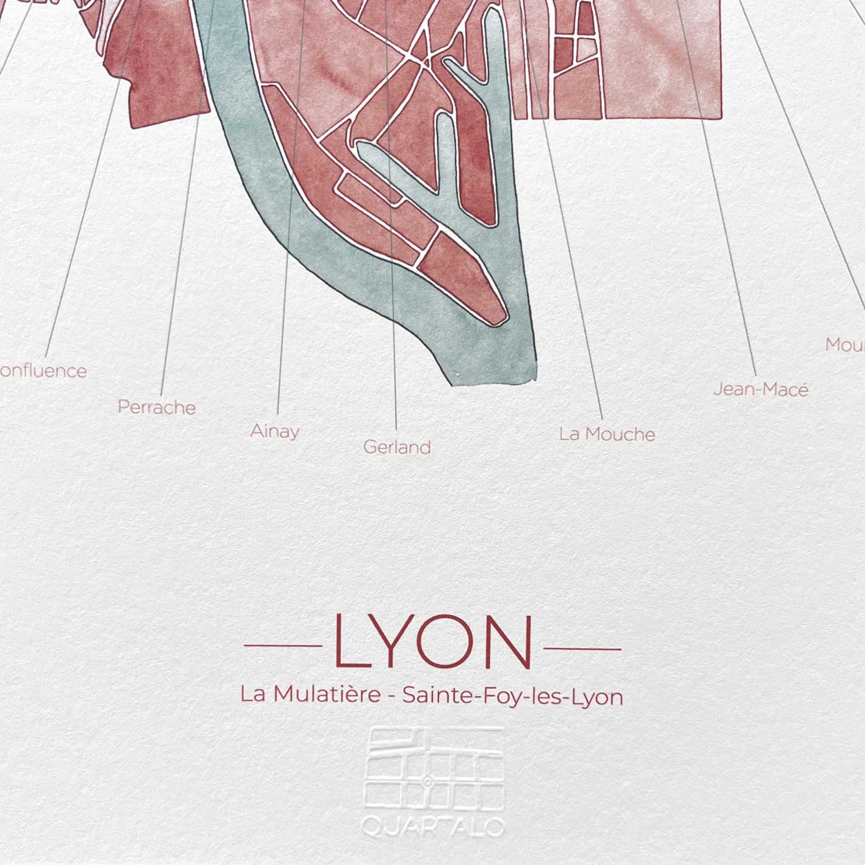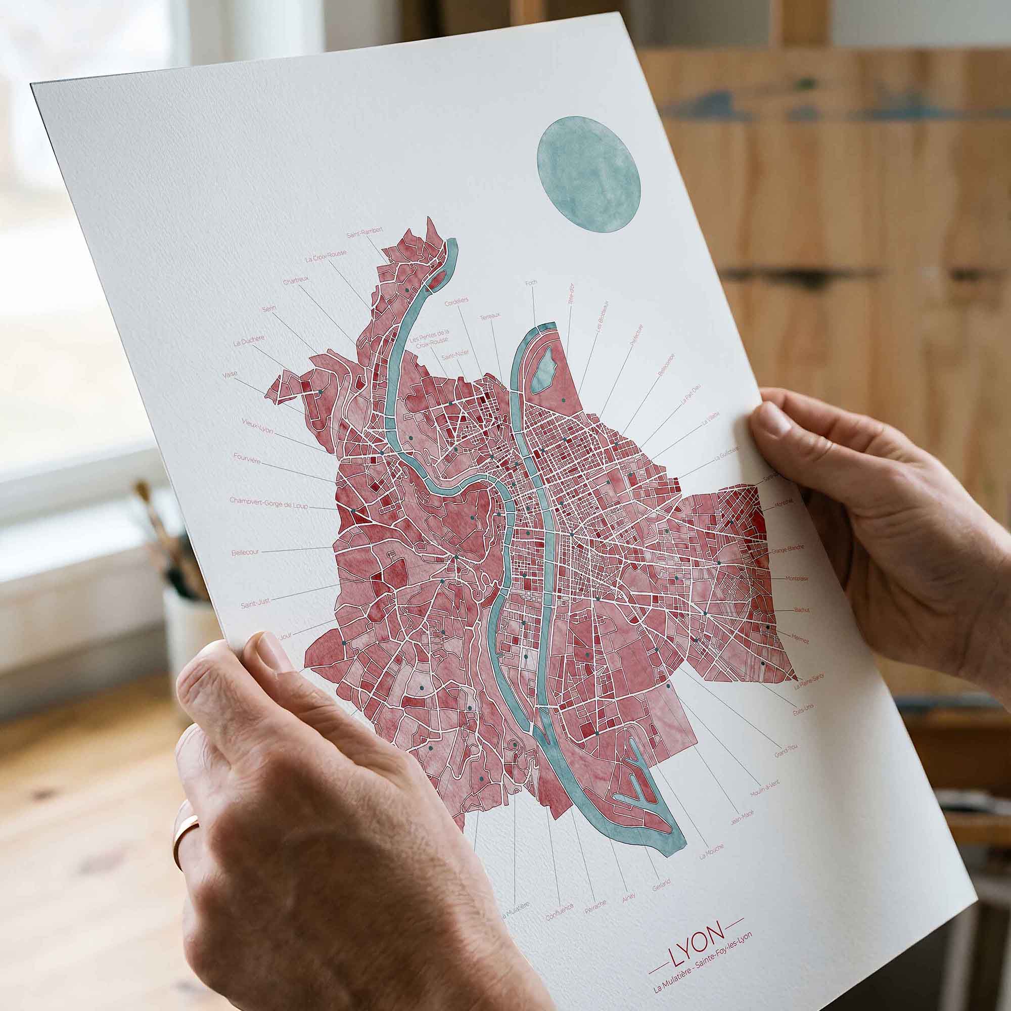 Affiche Lyon — Édition limitée 79.0 EUR Plan artistique peint à la main à l’aquarelle, représentant Lyon, Sainte-Foy-lès-Lyon et La Mulatière. Dans cette carte les quartiers sont nommés et légendés : retrouvez le vôtre et ceux qui...