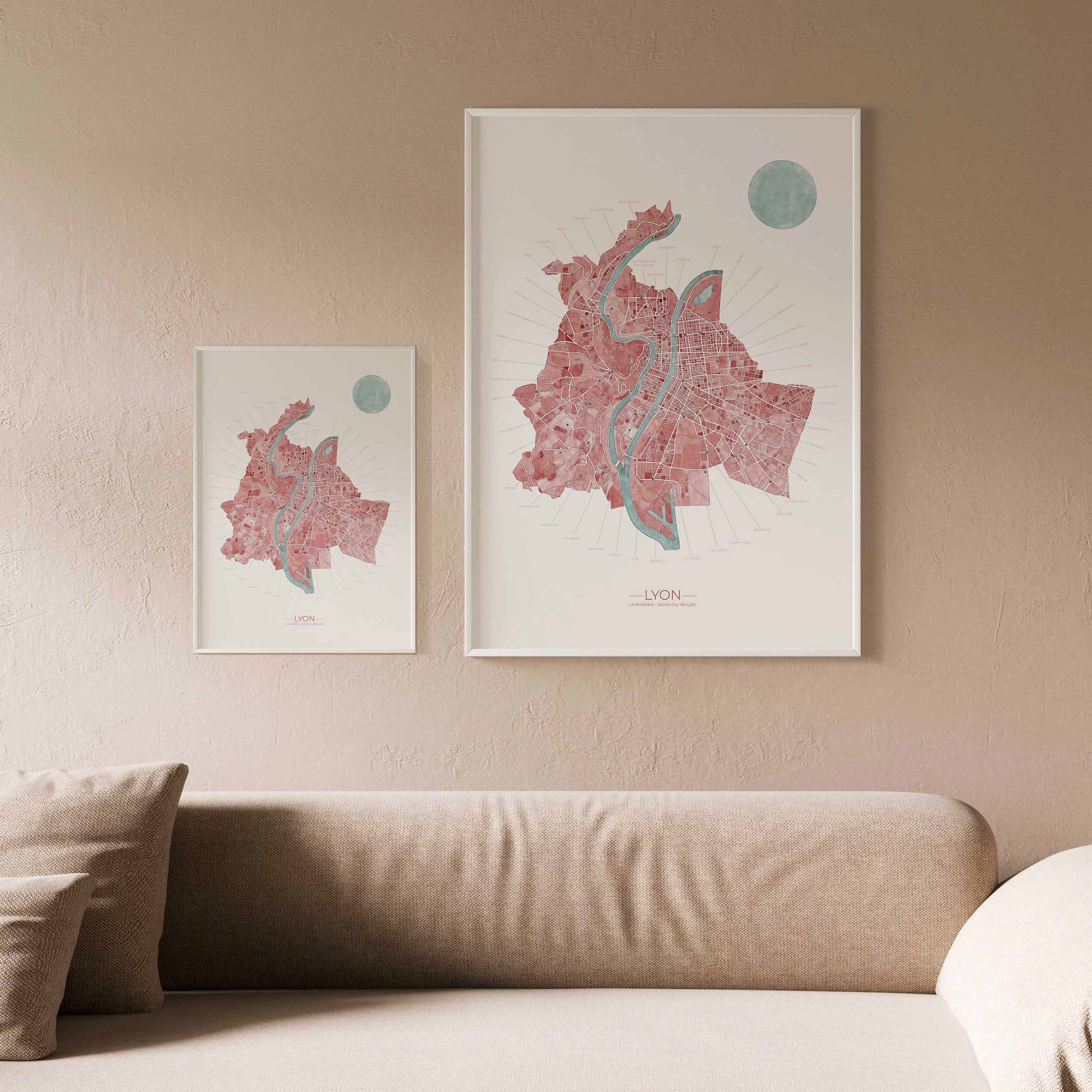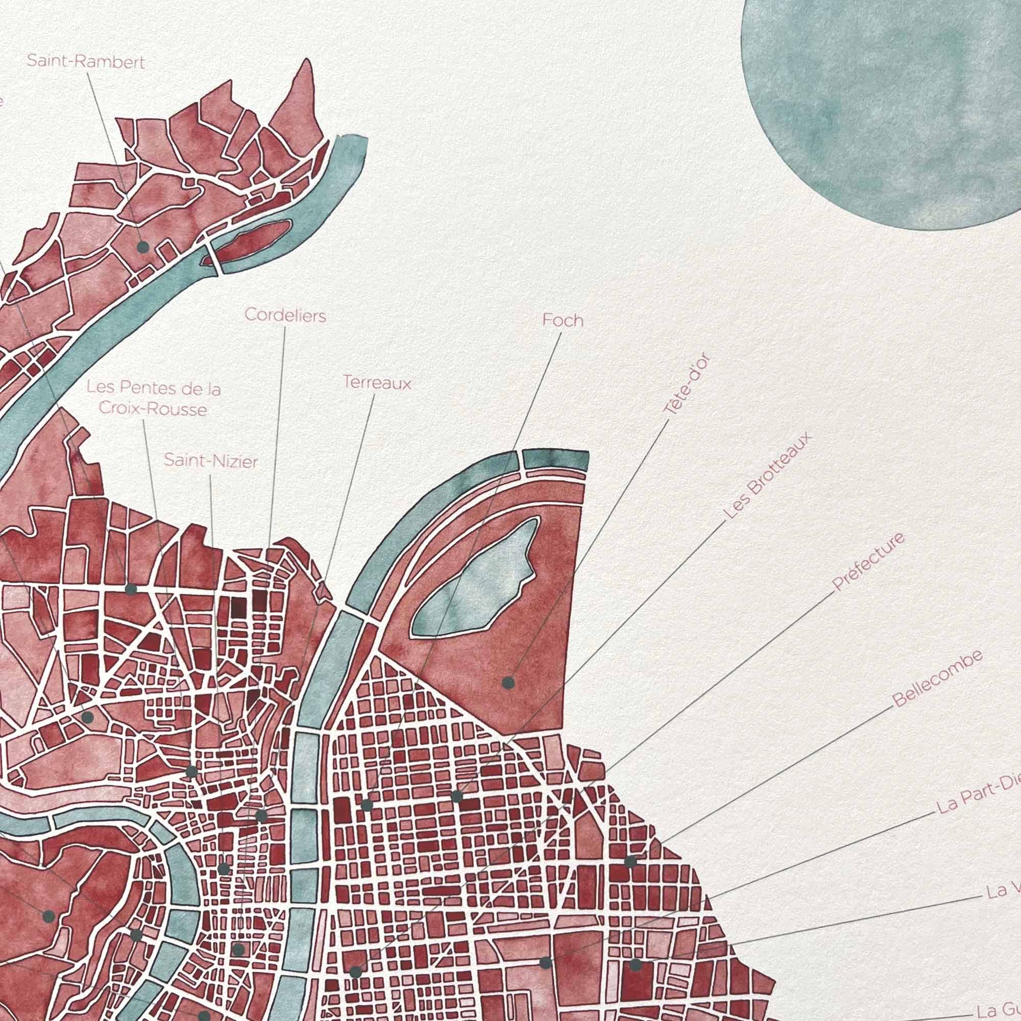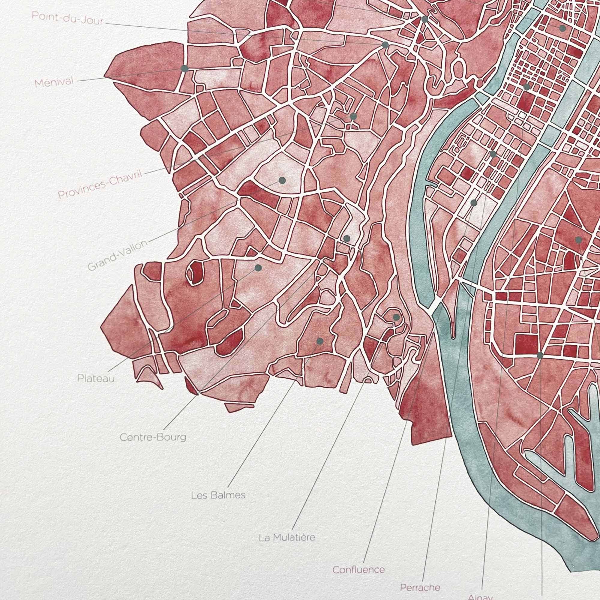Affiche Lyon — Édition limitée 79.0 EUR Plan artistique peint à la main à l’aquarelle, représentant Lyon, Sainte-Foy-lès-Lyon et La Mulatière. Dans cette carte les quartiers sont nommés et légendés : retrouvez le vôtre et ceux qui...